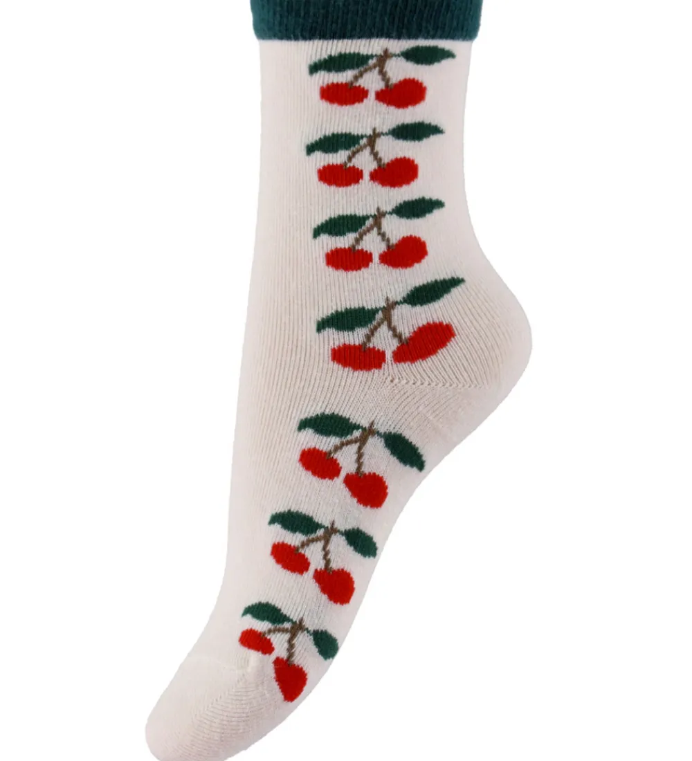 Charmerende Konges Sløjd strømper i en 2-pak med et par i hvid med røde og grønne kirsebær samt et par i mørkegrøn med en hvid top og små kirsebær. Strømperne har en god pasform med ribkant øverst, som sikrer en behagelig pasform. Konges Sløjd strømperne er fremstillet i et blødt og strækbart materiale.