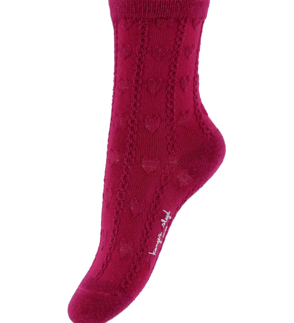 Charmerende Konges Sløjd strømper i en praktisk 2-pak med et par i lyserød og et i fuchsia. Begge par strømper har et diskret hjertemønster og en fin ribkant øverst på skaftet. Konges Sløjd strømperne har et behageligt design, der sikrer en god pasform.