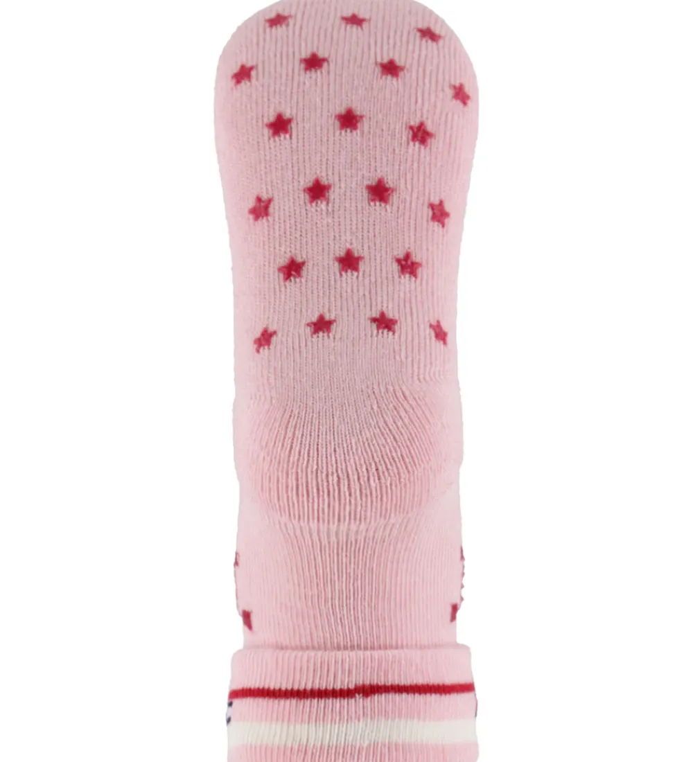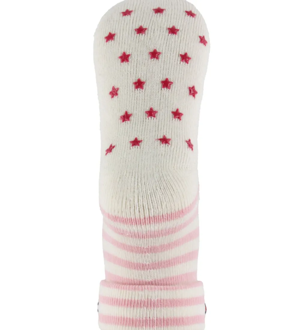 Charmerende Tommy Hilfiger strømper i en 2-pak med forskellige design. Et par er lyserøde med et enkelt “T” på siden, mens det andet par er stribet i hvid og lyserød. Tommy Hilfiger strømperne har en ribkant øverst for en god pasform. Strømperne har stjerneformede silikonedutter under fødderne, som giver et godt fodfæste.