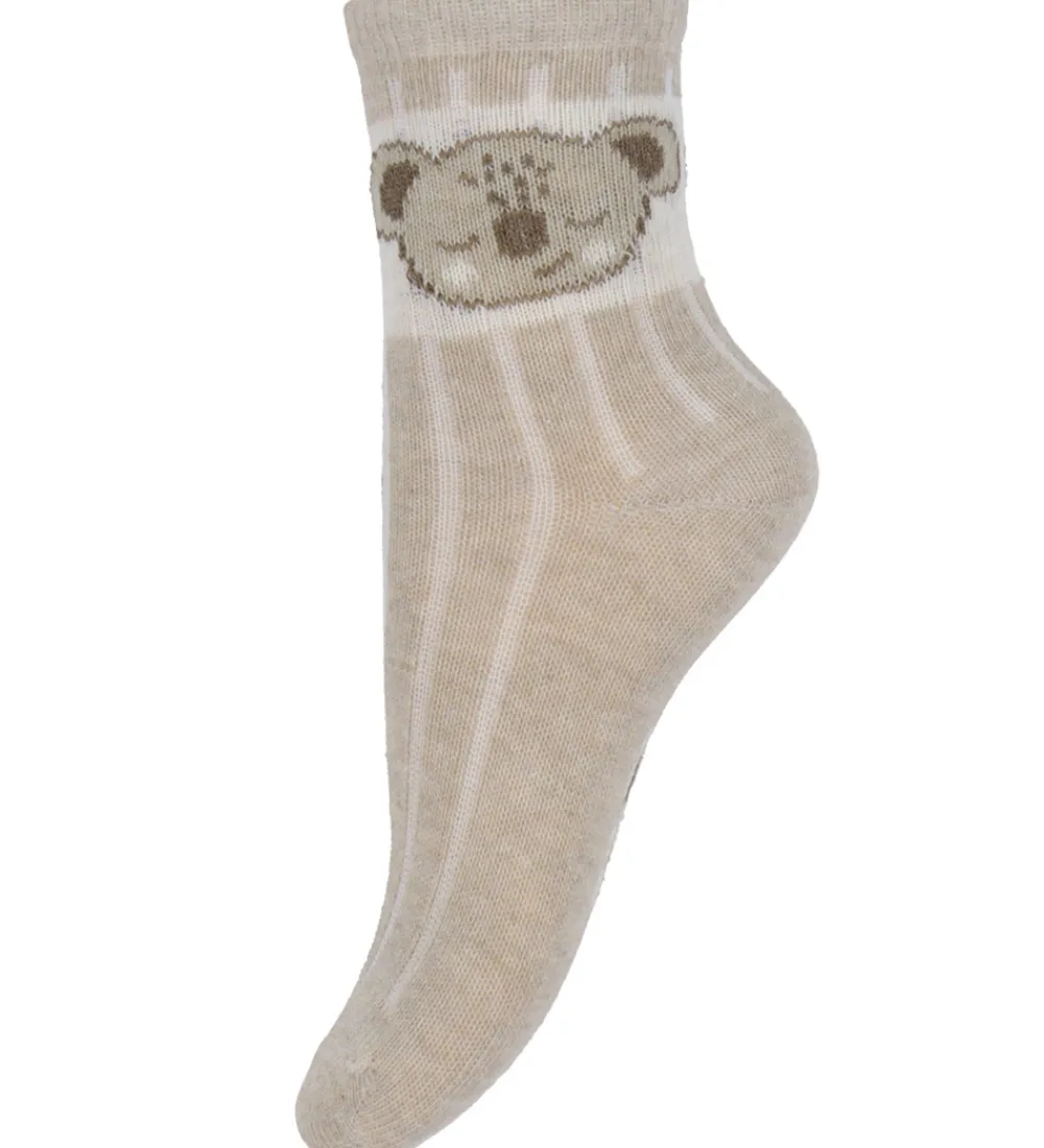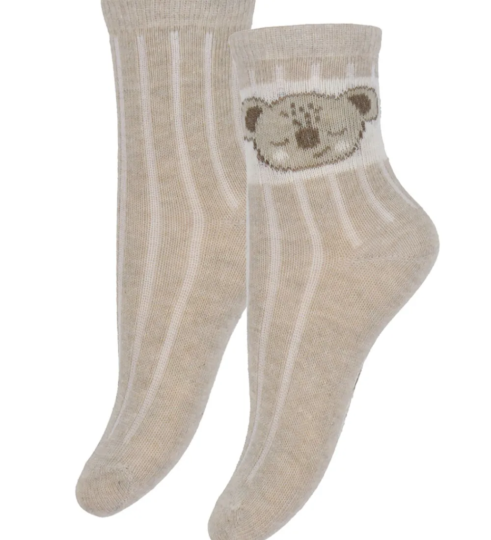 Fine Minymo strømper solgt i en 2-pak. Det ene par er meleret beige med ribstruktur, og det andet par er meleret beige med et sødt dyremotiv og med ribstruktur.