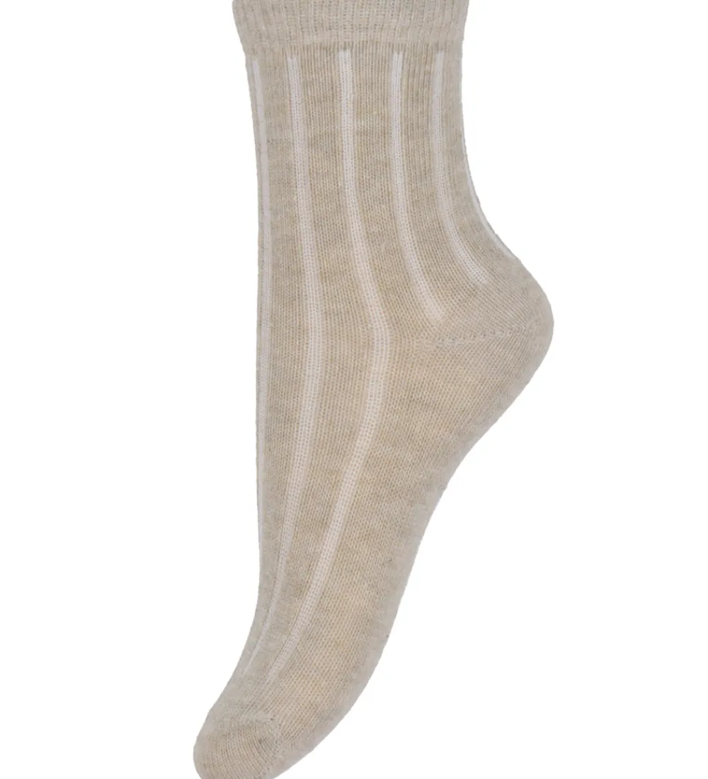 Strømperne har et almindeligt længde skaft med en smal, elastisk ribkant.