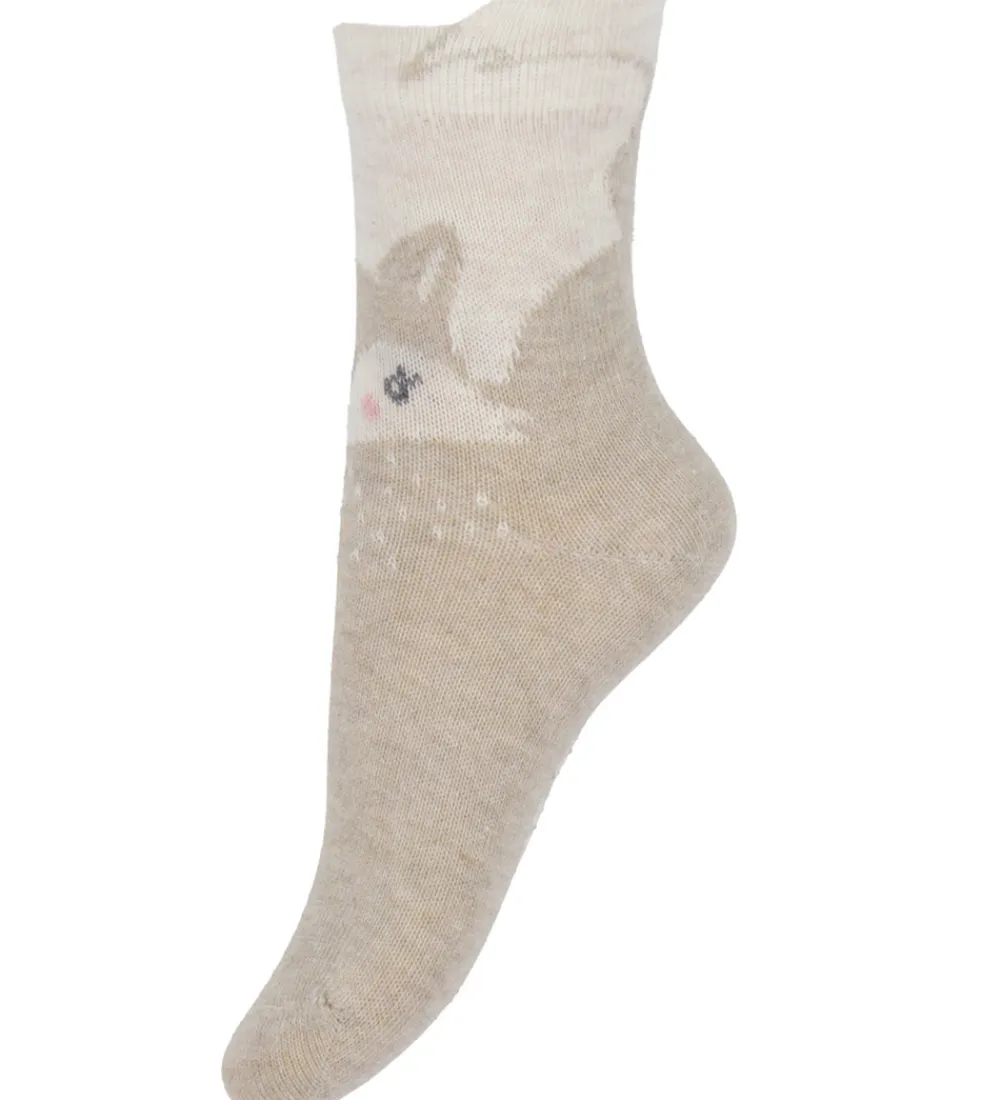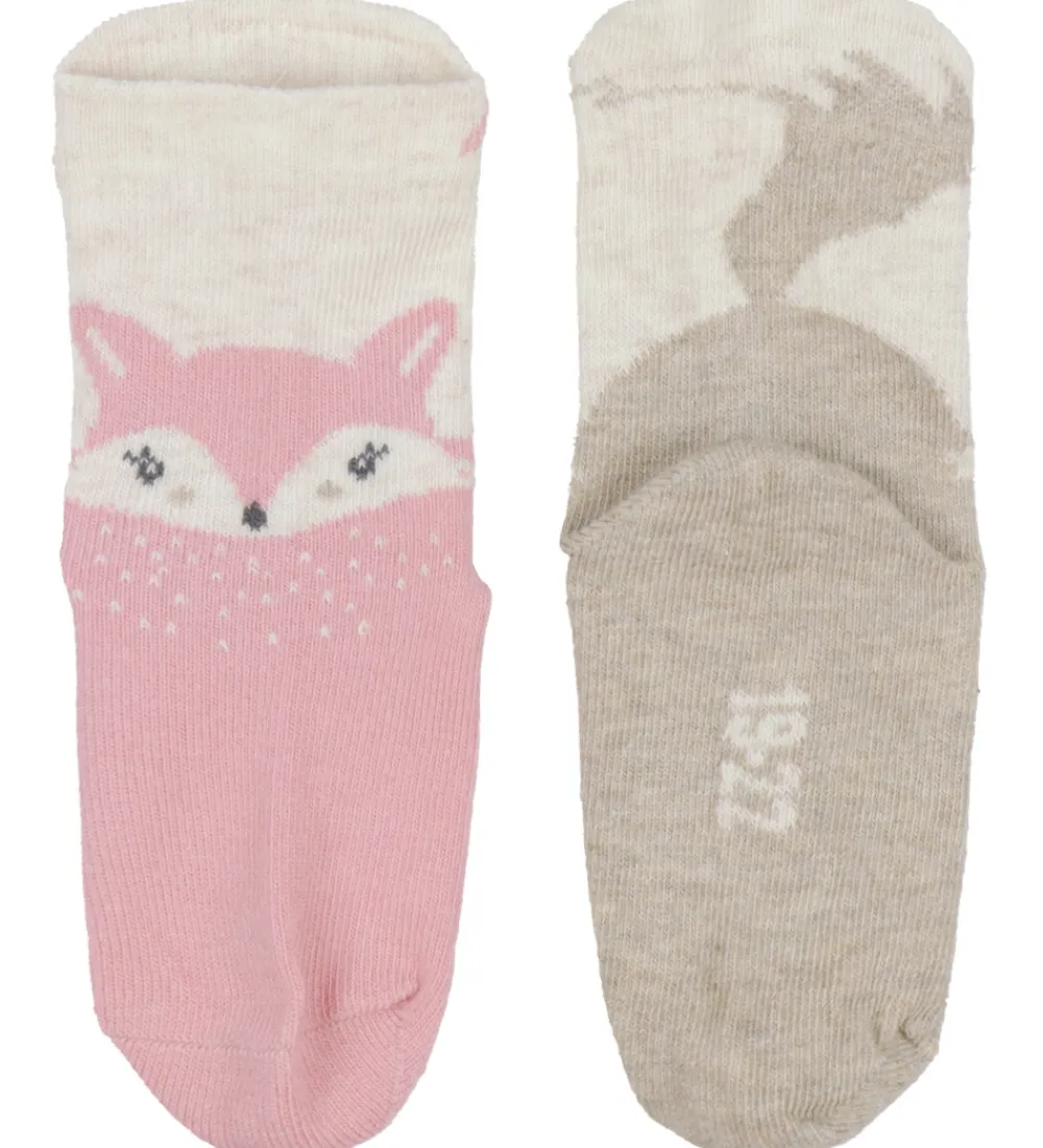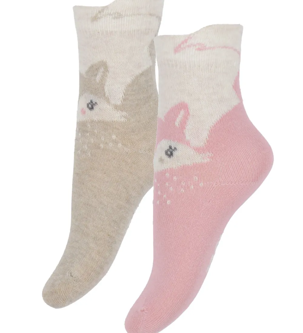 Søde Minymo strømper solgt i en 2-pak. Det ene par er meleret beige og cremefarvet med et motiv med et dådyr, og det andet par er rosa og cremefarvet med et motiv med et dådyr.