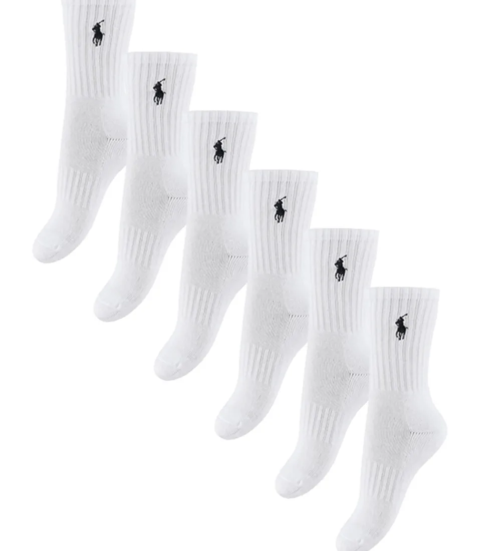 Fine Polo Ralph Lauren strømper solgt i en 6-pak i ensfarvet hvid. Strømperne har en broderet logo på skaftet i navy. Polo Ralph Lauren strømperne har en flot ribstruktur på skaftet, og de er ekstra vatterede ved hælene og tæerne, og omkring vristen er der ekstra støtte.