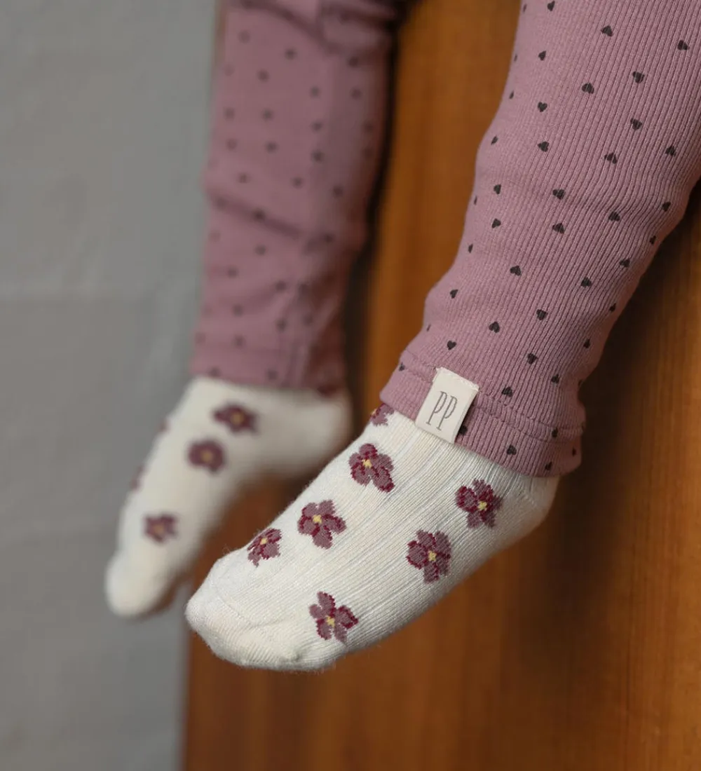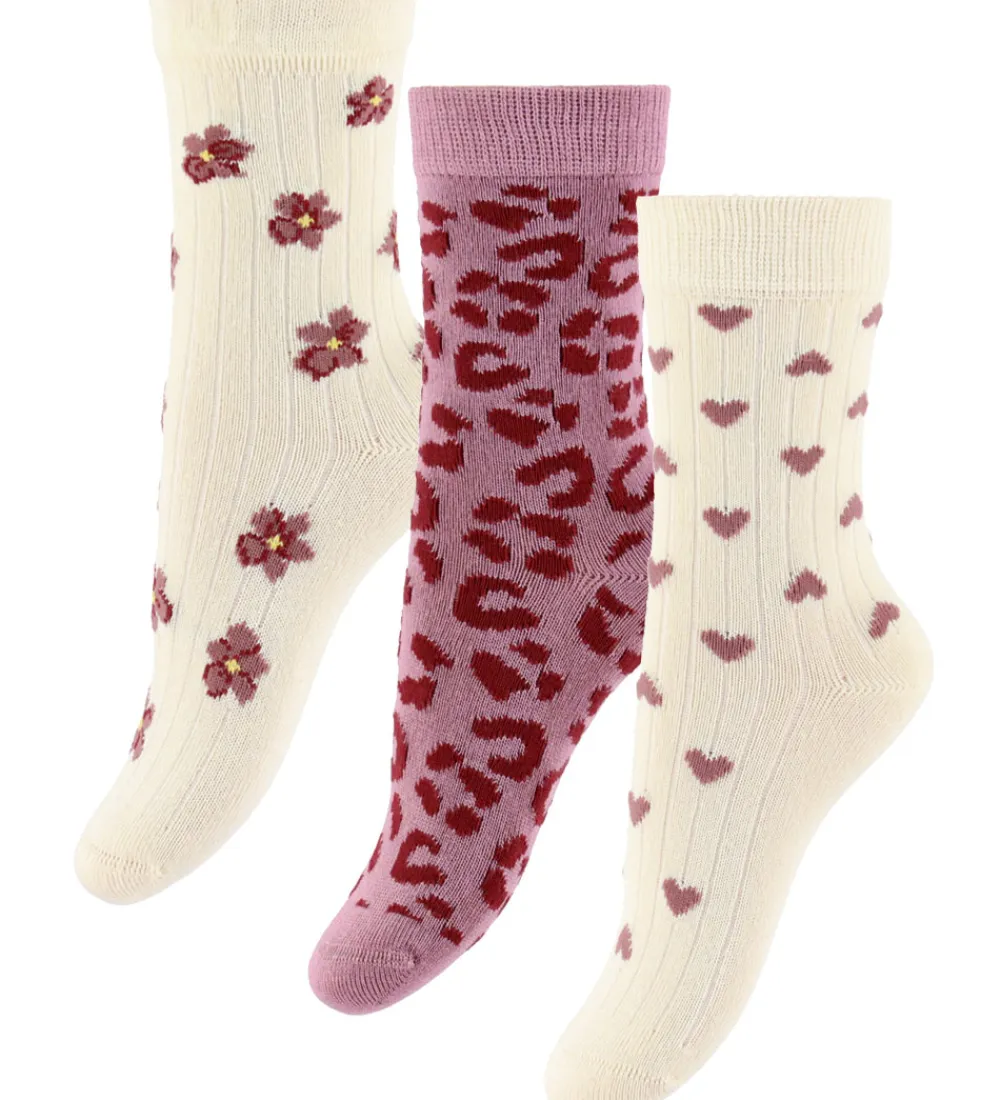 Attraktive MiniPop strømper i en 3-pak med forskellige mønstre. Et par er råhvide med blomster, et er mørk rosa med leopardmønster, og et tredje er råhvide med små hjerter. Strømperne har et langt skaft med en robust ribkant øverst for god pasform.