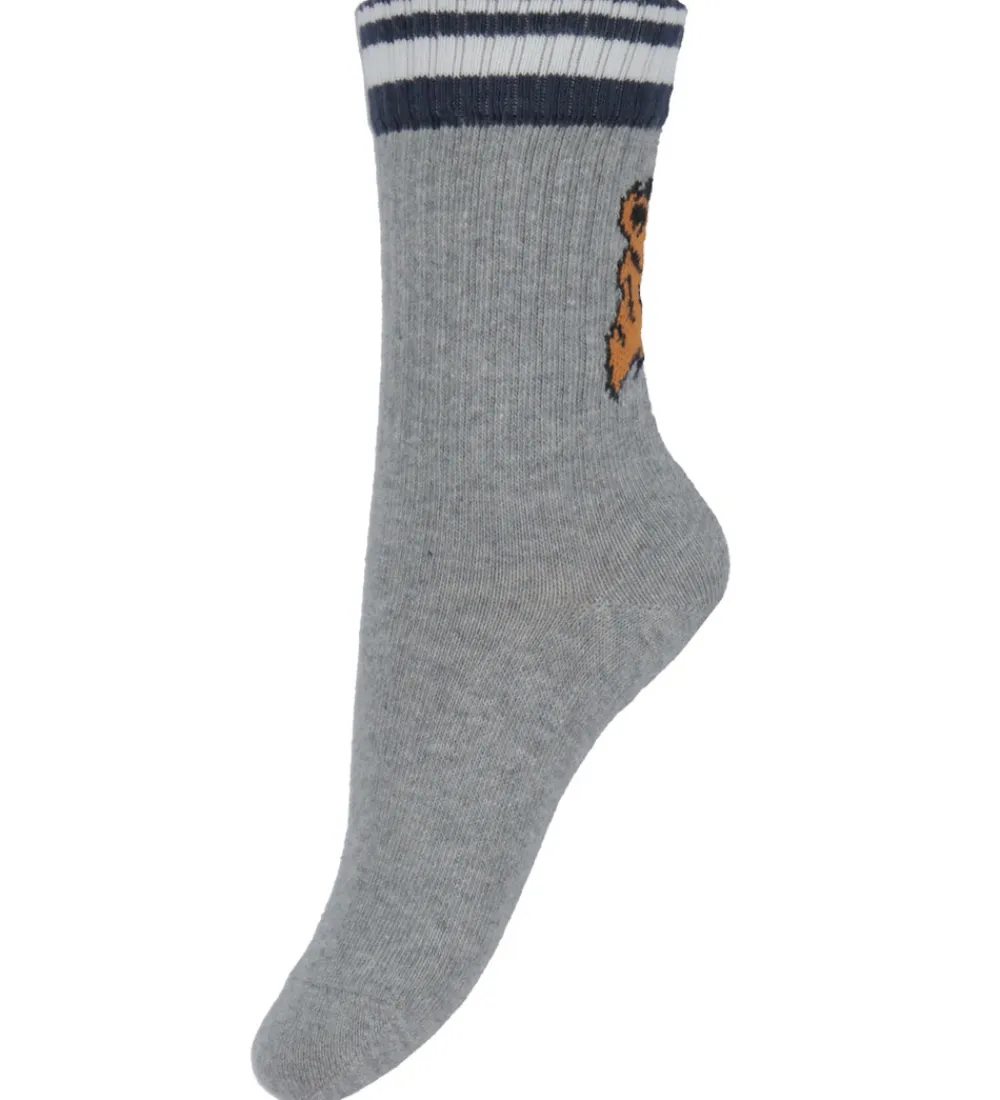 Flotte Melton strømper i meleret lysegrå, og bag på skaftet er der en orange tiger med sorte striber. Strømperne har et almindeligt længde skaft med ribstruktur som tennisstrømper.