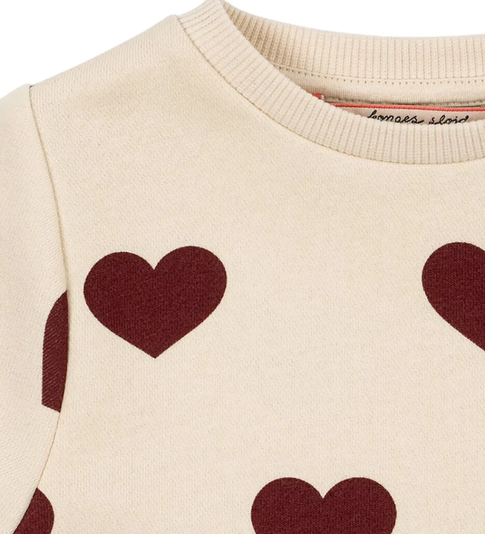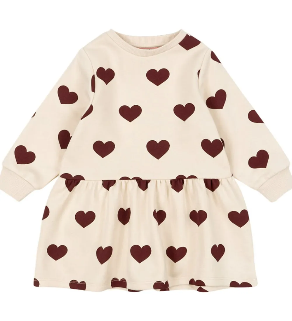 Lækker kjole fra Konges Sløjd i cremefarvet sweat med et print med mørkerøde hjerter. Konges Sløjd sweatkjolen har lange ærmer og brede ribkanter, og på indersiden er der blødt, børstet bomuld.
