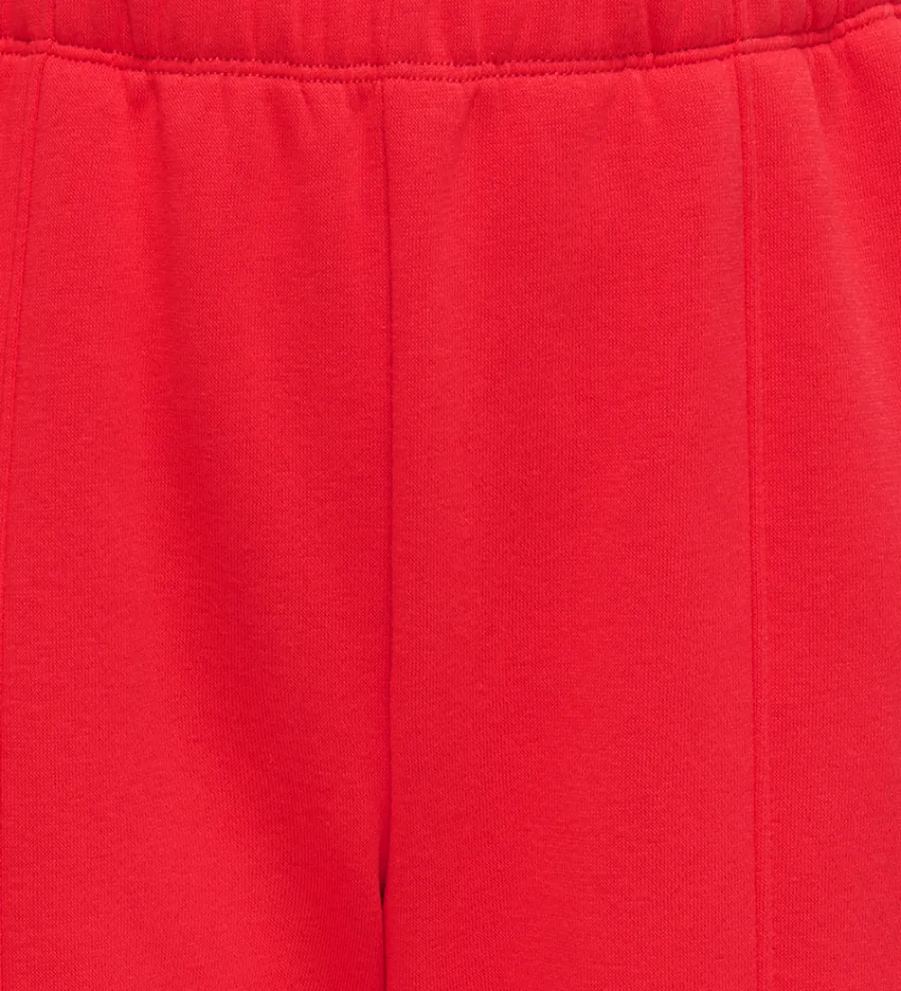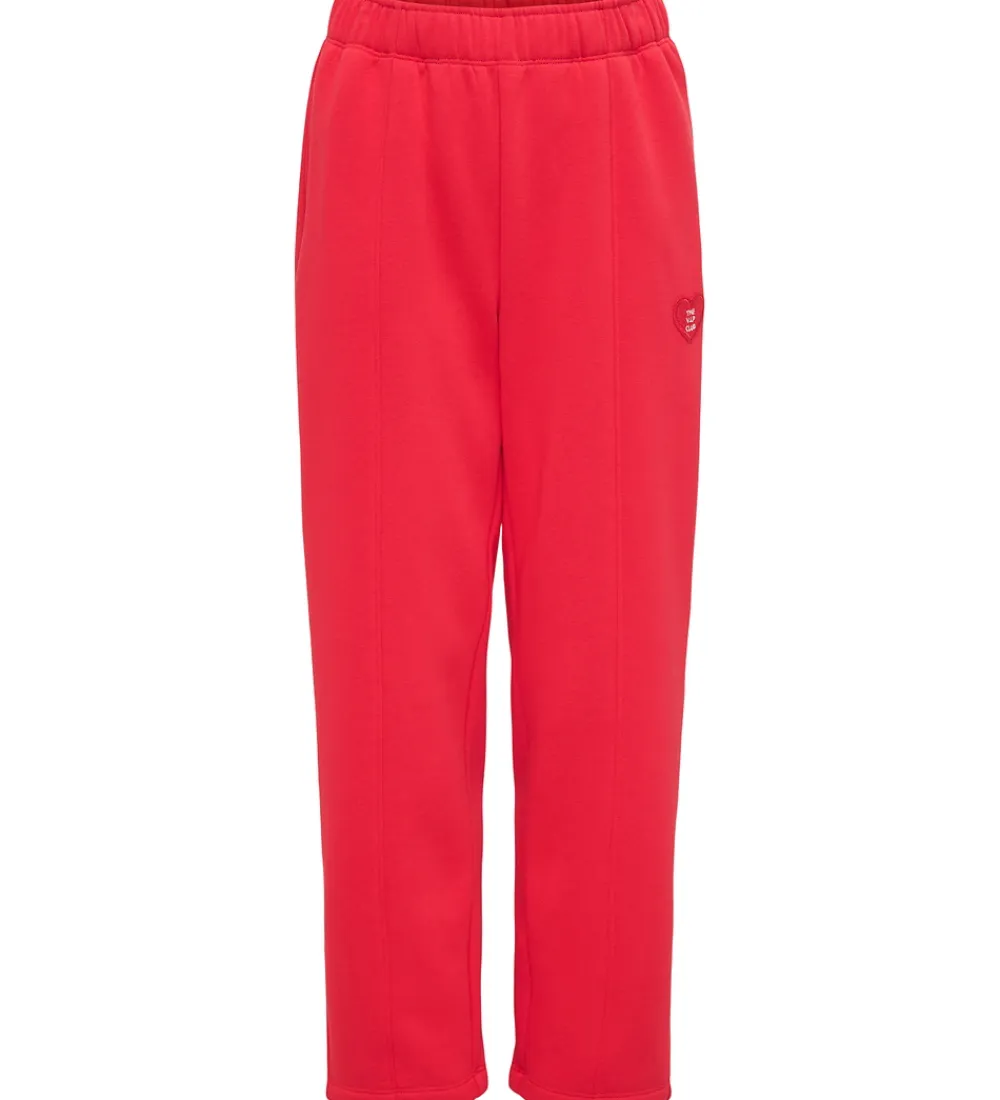 Flotte Kids Only sweatpants i klar rød farve med et broderet, rødt hjerte på venstre lår. Sweatpantsene har en elastisk talje, som kan justeres med knapper indvendigt. Øverst er der en lomme i hver side. Sweatpantsene har en afslappet pasform med lige ben. Indvendigt er der blødt, børstet bomuld.