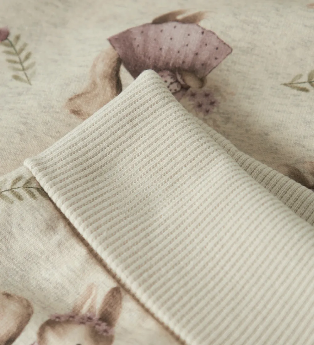 Flotte Name It sweatpants i meleret beige med et print af kaniner med kjoler på. Sweatpantsene har en bred og elastisk ribkant i livet og ved anklerne, hvilket sikrer en behagelig pasform. Name It sweatpantsene har blødt, børstet bomuld indvendigt.