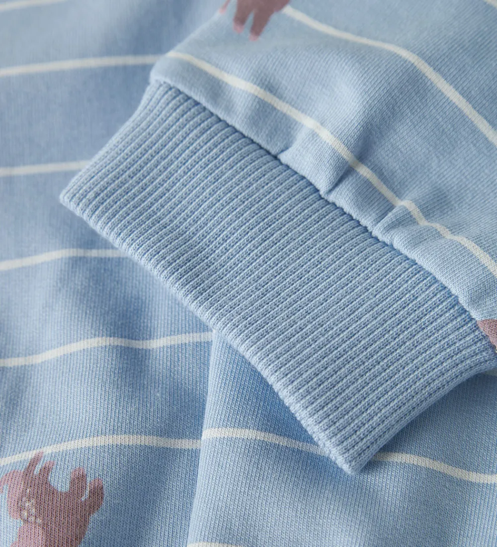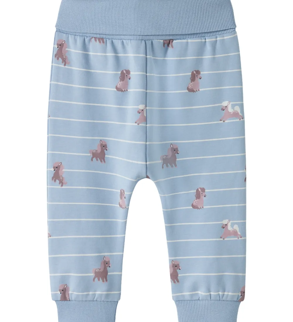 Søde Name It sweatpants i lyseblå med hvide striber og print af små heste i rosa og lilla nuancer. Sweatpantsene har en elastisk ribkant i livet og ved anklerne, der giver en behagelig pasform.