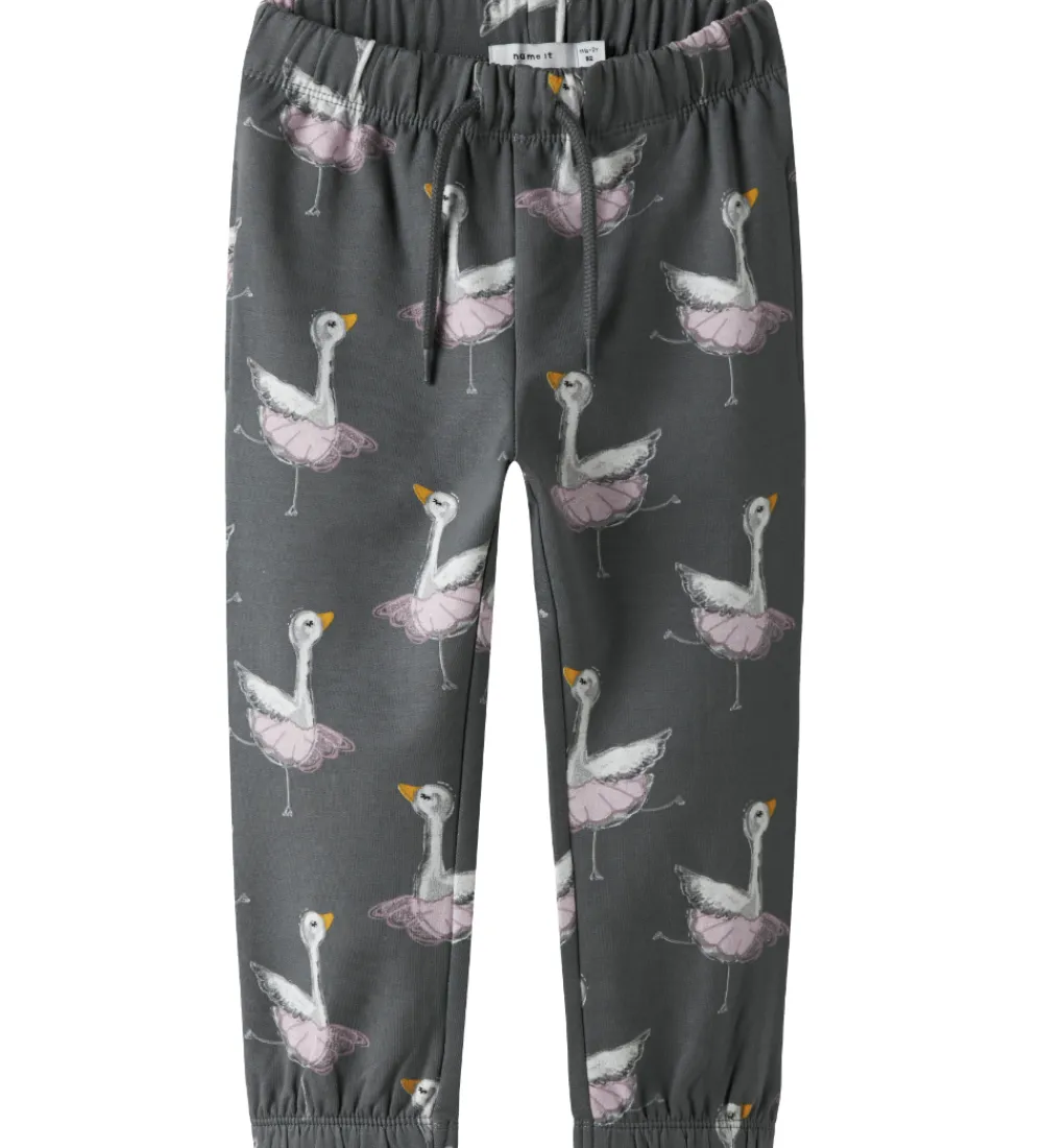 Fine Name It sweatpants i mørkegrå med print af svaner med balletskørt. Sweatpantsene har en elastisk talje, som kan justeres med knapper indvendigt. Fortil er der dekorative snører og en lomme i hver side. Sweatpantsene har elastik ved anklerne og blødt, børstet bomuld indvendigt.