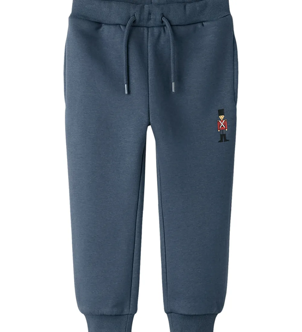 Smarte Kids Only sweatpants i støvet blå med en lille soldat på venstre lår. Sweatpantsene har en elastisk talje, som kan justeres med knapper indvendigt. Fortil er der dekorative snører og en lomme i hver side. I benåbningerne er der ribkanter, og indvendigt er der blødt, børstet bomuld.