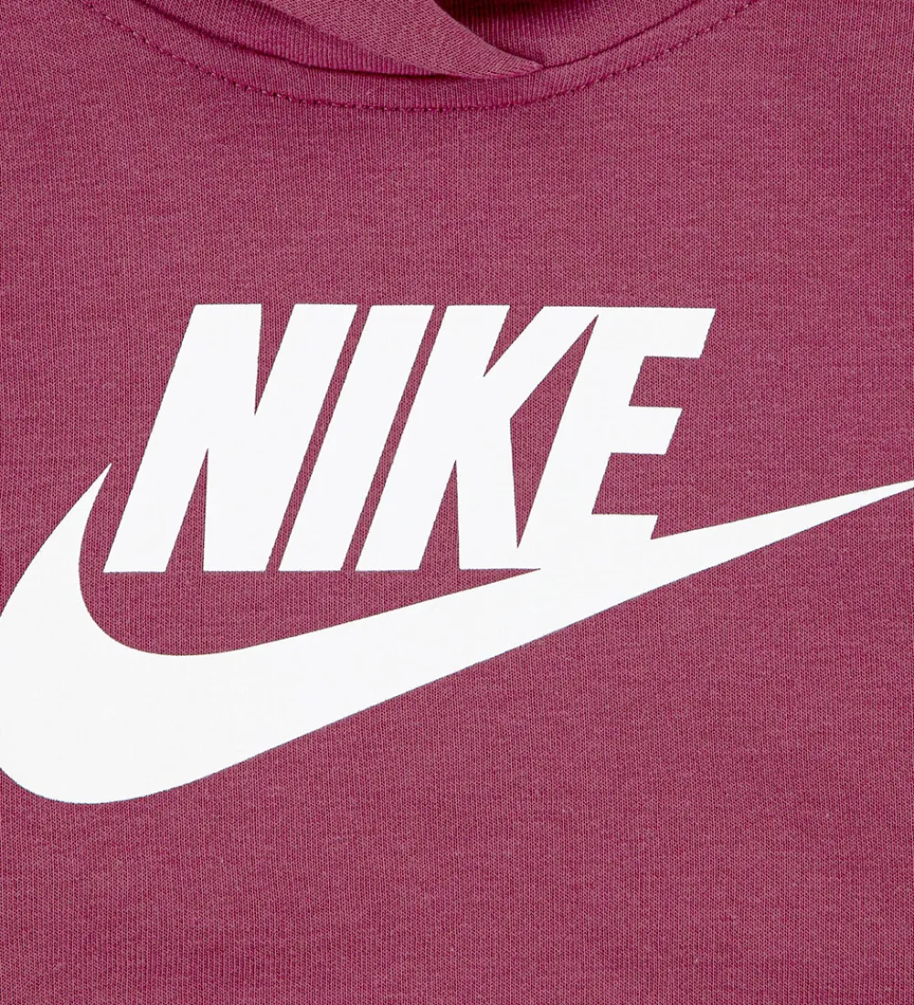 Skønt Nike sweatsæt i støvet rød med en markant, hvidt logoprint på både hættetrøje og sweatpants.