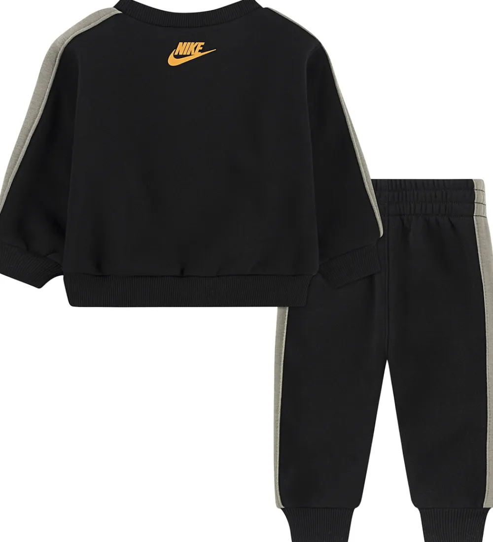 Stilfuldt Nike sweatsæt i sort med farverige detaljer. Det karakteristiske logo pryder både overdel og underdel med flotte patches på sweatshirten. Nike sweatshirten har ribkanter ved hals, ærmer og bund. De lange ærmer har grå striber langs siderne, der giver et moderne udtryk. Sweatpantsene har elastik i taljen og en bred ribkant ved anklerne. Begge dele er lavet med blødt børstet bomuld på indersiden.
