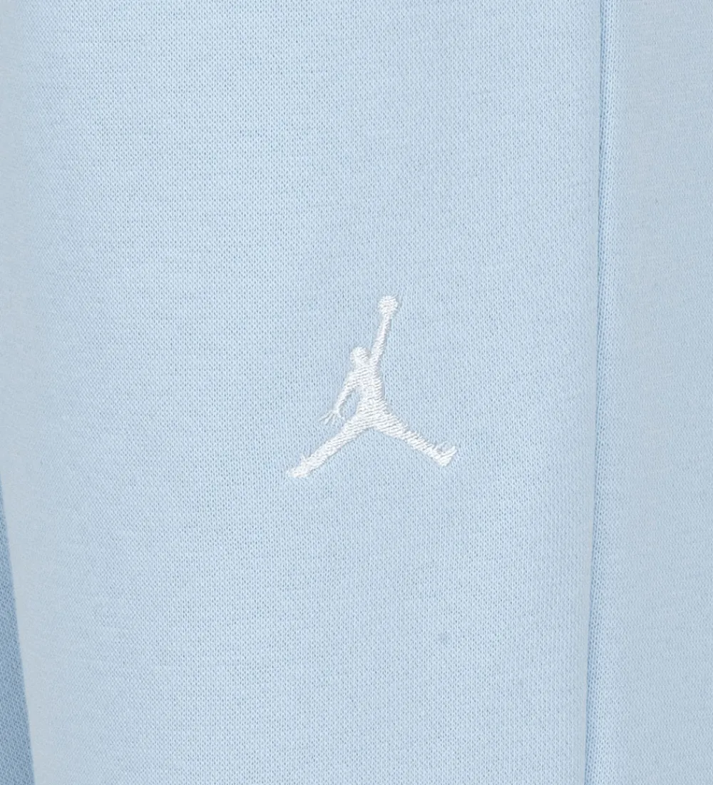 Blødt Jordan sweatsæt, der består af en hættetrøje og et par sweatpants. Begge dele er i lyseblå med et hvidt broderet logo i venstre side.