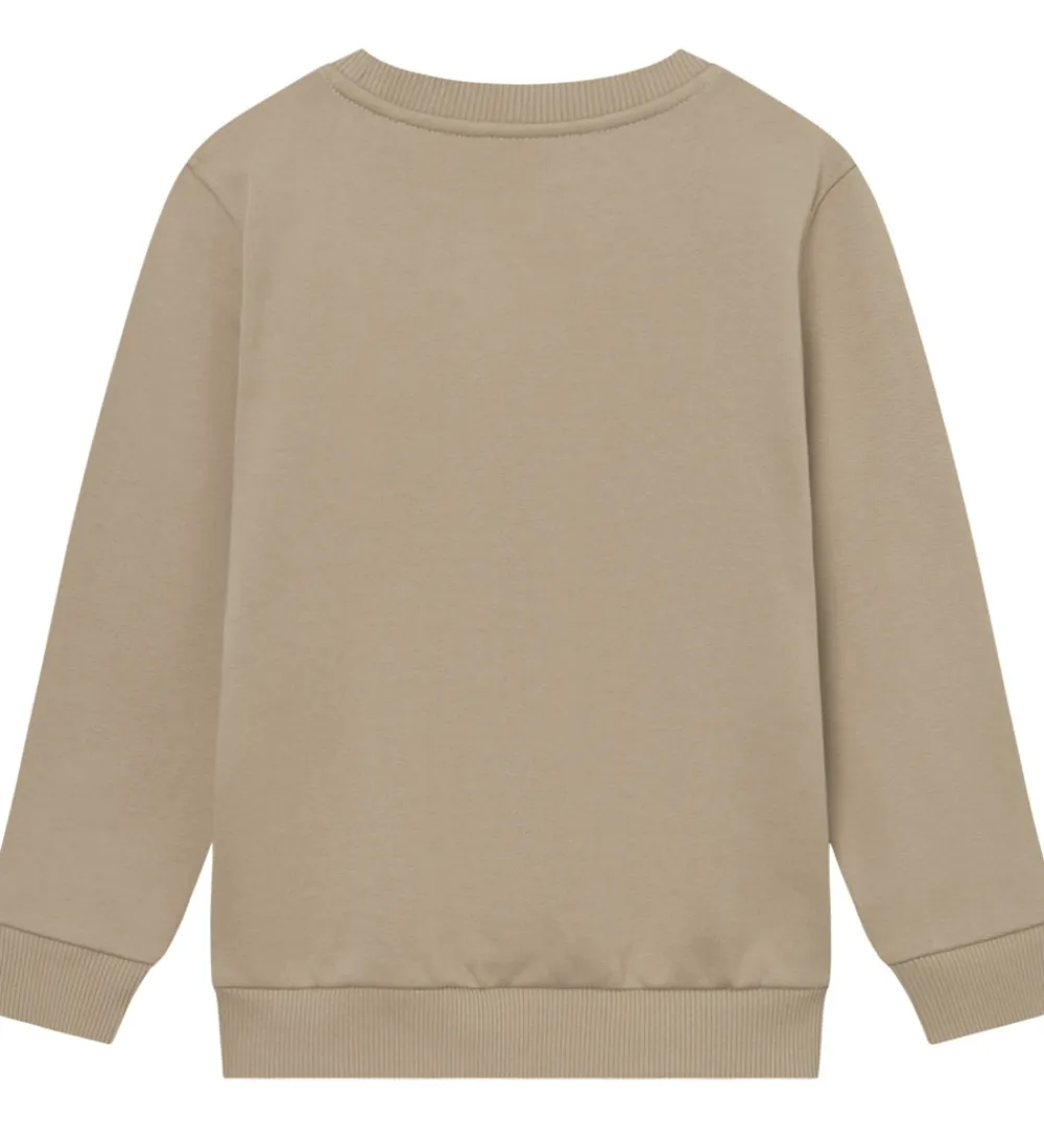 Stilfuld Les Deux sweatshirt i en beige nuance med mørkegrønne bogstaver, der danner et markant logo på fronten. Les Deux sweatshirten har rund halsudskæring og lange ærmer, suppleret med ribkanter, som bidrager til det enkle design.