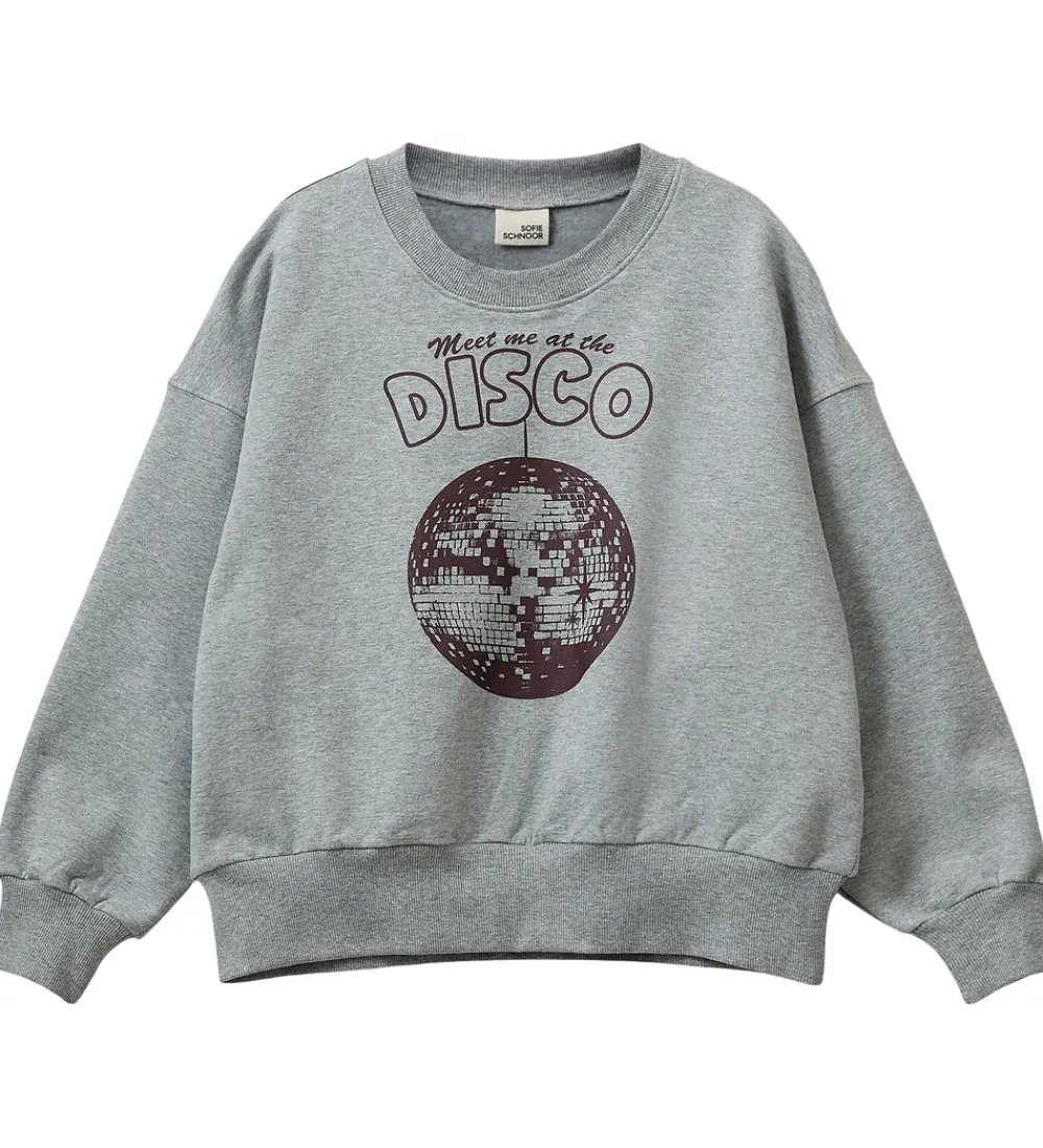 Smart Sofie Schnoor sweatshirt i gråmeleret med et iøjnefaldende disco-tema. Sofie Schnoor sweatshirten har lange ærmer og en rund hals. Foran ses et print med teksten “Meet me at the DISCO” over en stor diskokugle i mørk nuance.