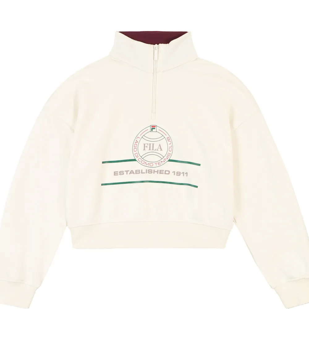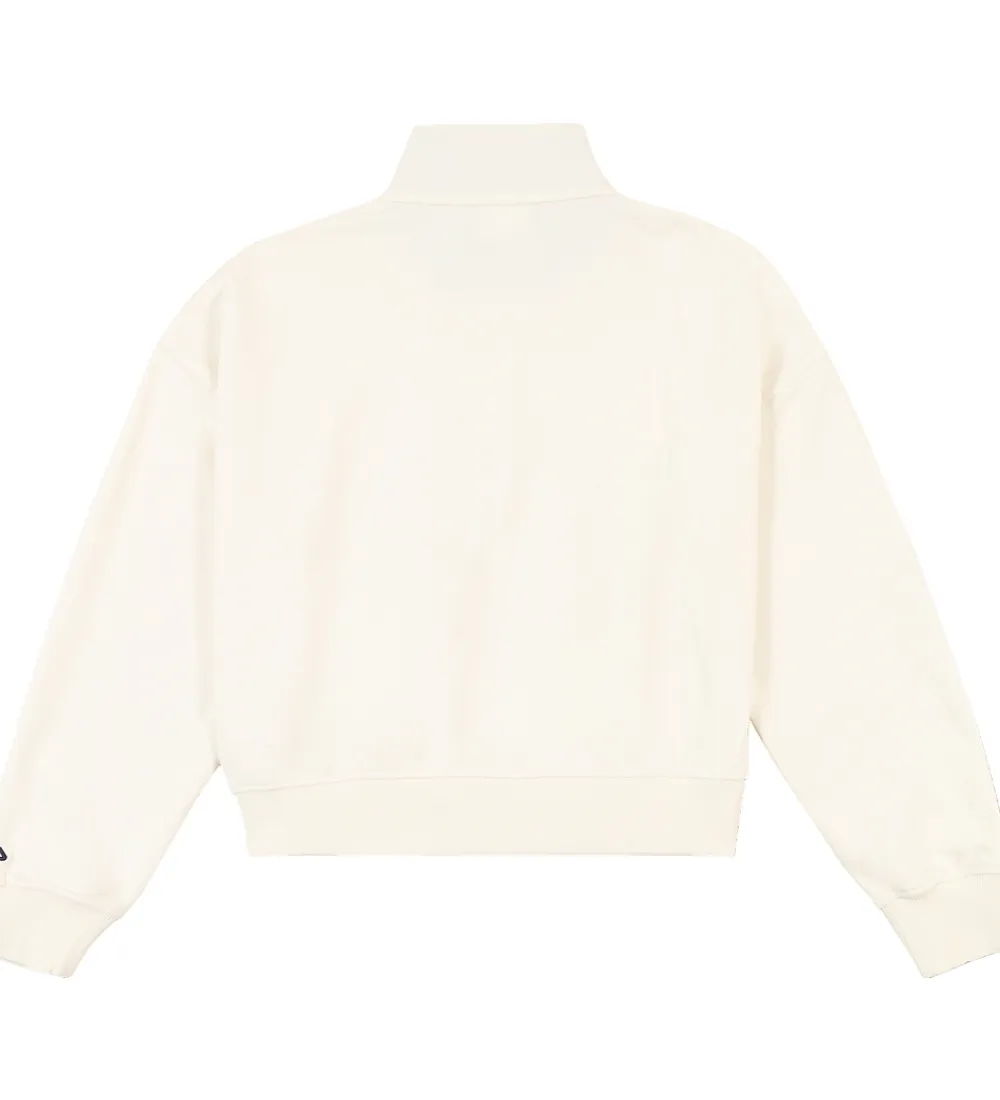 Skøn Fila sweatshirt i en lys cremefarve med et stilrent print på forsiden. Fila sweatshirten har en mellemhøj krave med lynlås og lange ærmer, hvilket tilføjer en moderne detalje. De elastiske ribkanter ved håndleddene sikrer en god pasform.
