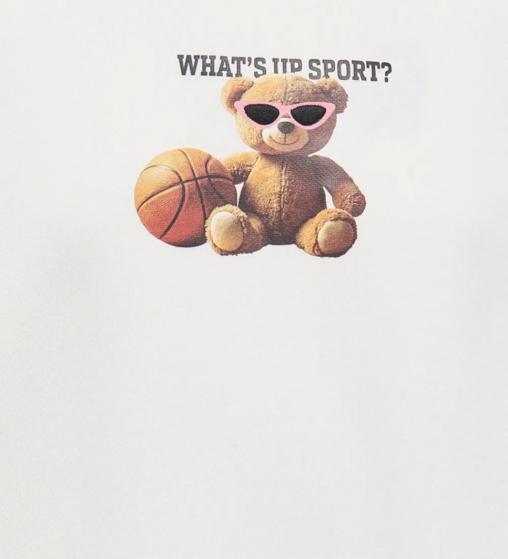 Smart Kids Only sweatshirt i hvid med et humoristisk print af en teddybjørn iført solbriller med teksten “What’s Up Sport?” på fronten. på ryggen er der et stort, sort print med teksten San Francisco 31 California Dreaming”. Kids Only sweatshirten har lange ærmer og rund halsudskæring, hvilket giver et enkelt og tidløst udtryk. Indvendigt er der blødt, børstet bomuld.