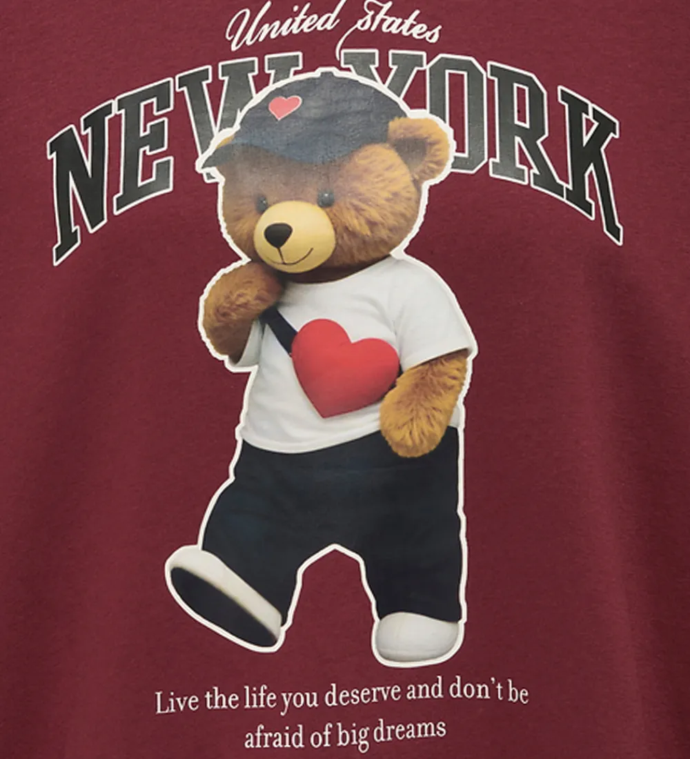 Stilfuld Kids Only sweatshirt i en dyb bordeaux farve med et charmerende print af en bamse iført tøj. Under bamsen ses teksten “Live the life you deserve and don’t be afraid of big dreams”. Kids Only sweatshirten har lange ærmer og en rund hals. Indvendigt er der blødt, børstet bomuld.