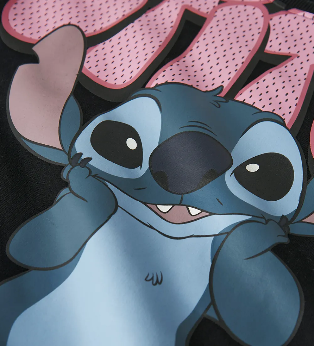 Charmerende Name It sweatshirt i sort med et stort, farverigt print af Disney-figuren Stitch. Name It sweatshirten har lange ærmer og en rund halsudskæring. Indvendigt er der blødt, børstet bomuld.