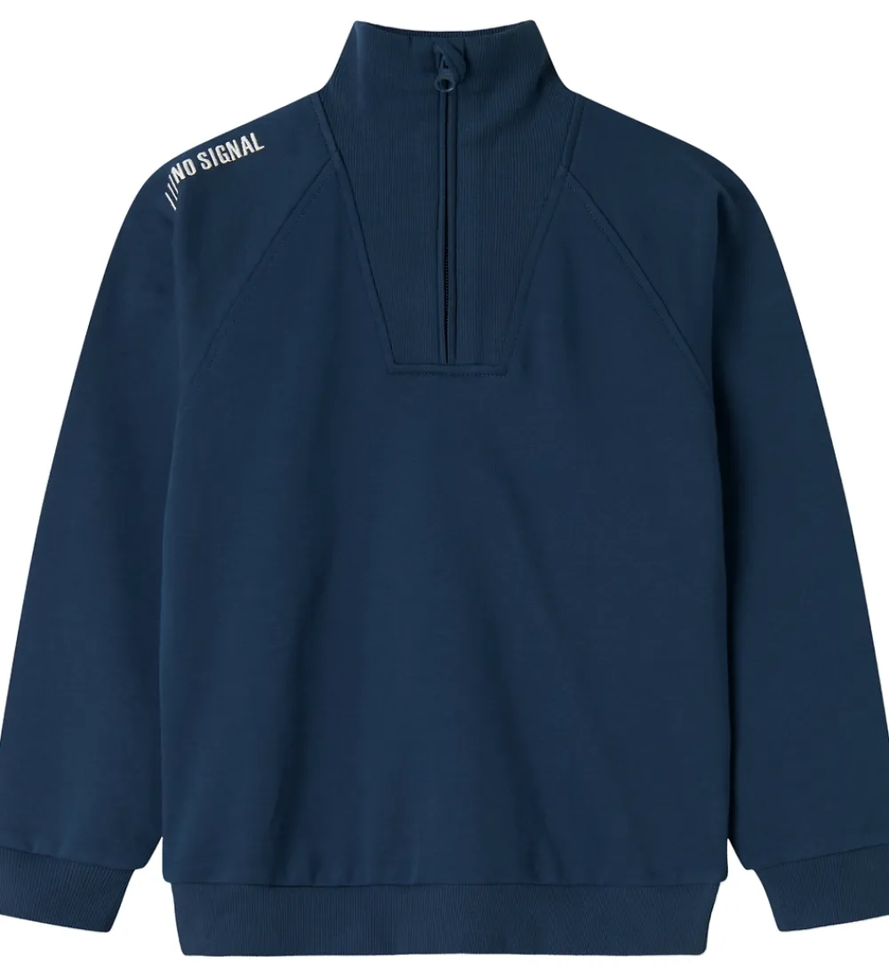Smart Name It sweatshirt i navyblå med en høj krave og kort lynlås fortil. På højre skulder er teksten “No Signal” broderet i hvid. Name It sweatshirten har lange ærmer og ribkanter. Indvendigt er der blødt, børstet bomuld.