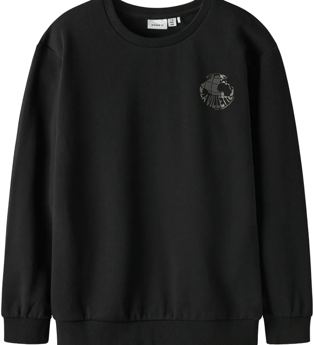 Smart Name It sweatshirt i sort med teksten globusprint på venstre bryst samt på ryggen. Sweatshirten har en rund halsudskæring med en smal ribkant og lange ærmer med brede ribkanter i ærme- og taljeåbning. Indvendigt er der blødt, børstet bomuld.