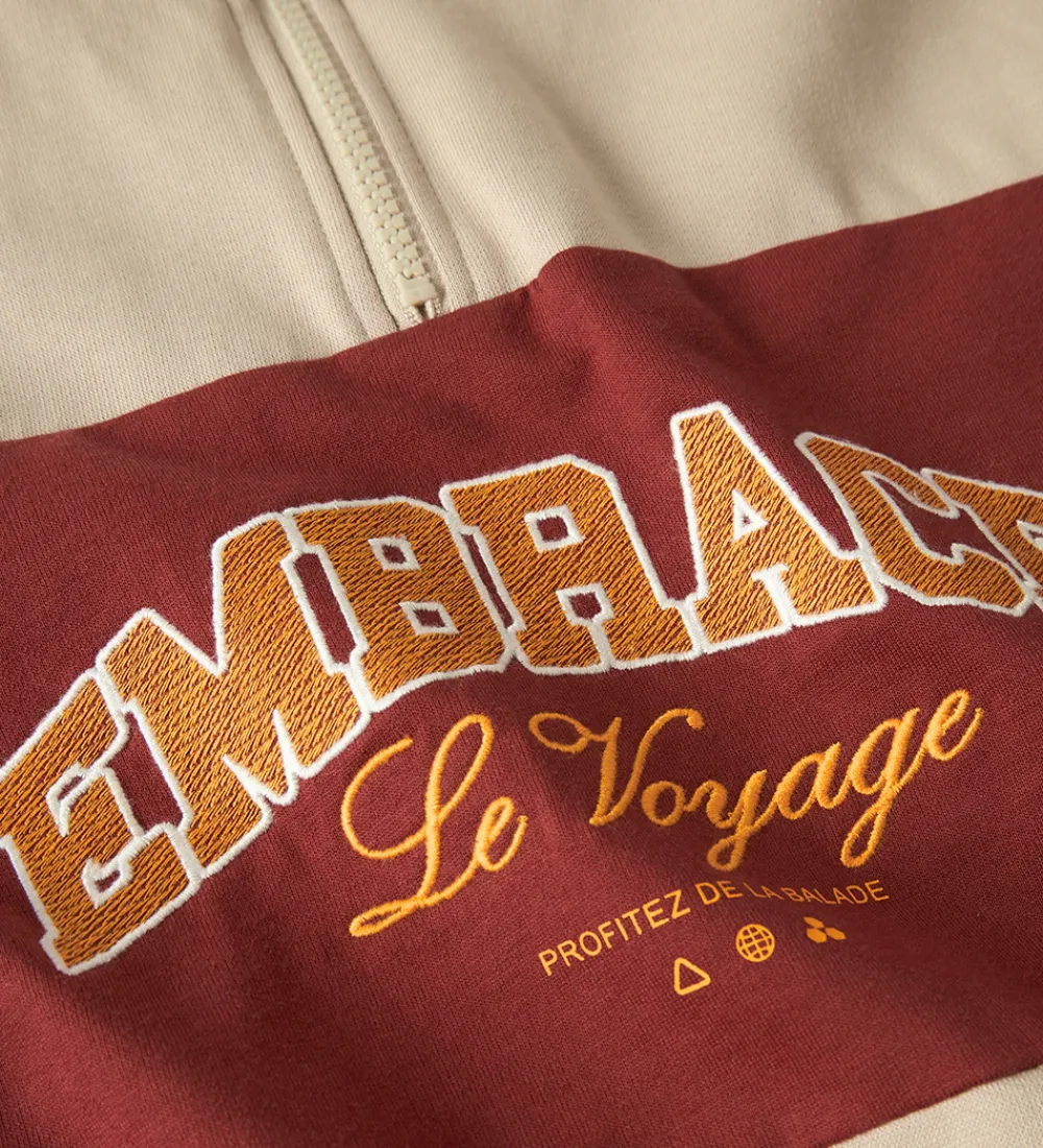 Sporty Name It sweatshirt i beige med en bred, rød stribe på midten med teksten “Embrace Le Voyage” broderet i orange. Name It sweatshirten har en mellemhøj krave med en kort lynlås fortil. Den har lange ærmer med brede ribkanter i ærmeåbningerne. Indvendigt er der blødt, børstet bomuld.