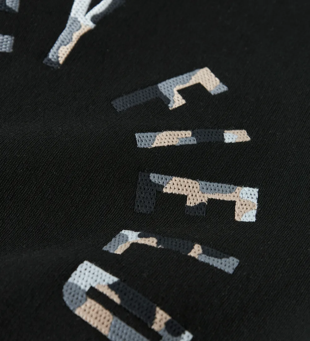 Moderne Name It sweatshirt i sort med teksten “Hockey Field” på forsiden i camouflageprint i blå og brun. Sweatshirten har lange ærmer og en rund halsudskæring. Den har ribkanter ved alle åbninger, og indvendigt er der blødt, børstet bomuld.