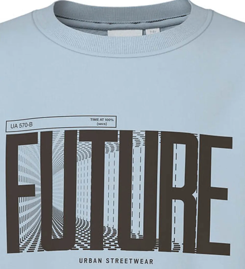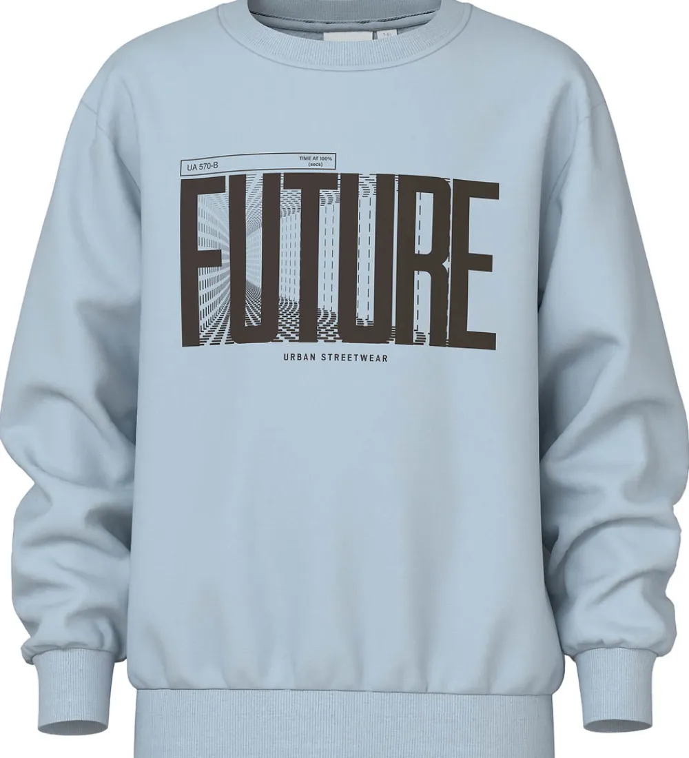 Stilfuld Name It sweatshirt i en lyseblå nuance med et markant print af ordet “FUTURE”.