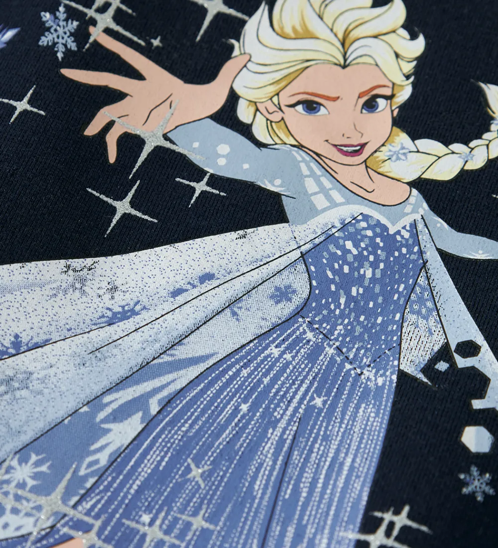 Fin Name It sweatshirt i navyblå med glimmer og et stort print på fronten af Elsa fra Disneyfilmen Frost. Name It sweatshirten har lange ærmer med rynker ved skuldrene og en rund halsudskæring, som skaber et enkelt og stilfuldt udtryk. Indvendigt er der blødt, børstet bomuld.