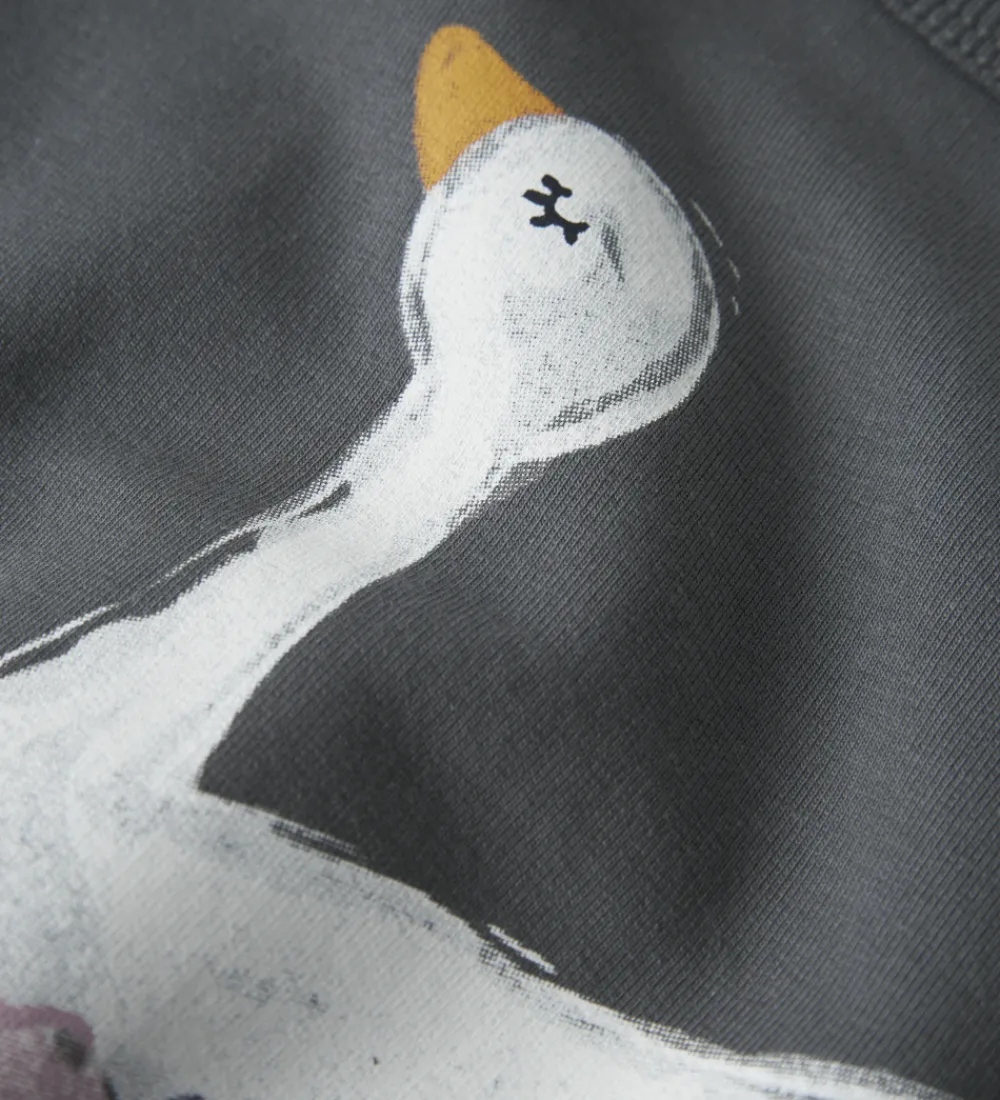 Skøn Name It sweatshirt i grå med et yndefuldt svanemotiv på fronten. Sweatshirten har en rund halsudskæring med en smal ribkant og lange ærmer med elastikkanter i åbningerne. Indvendigt er der blødt, børstet bomuld.