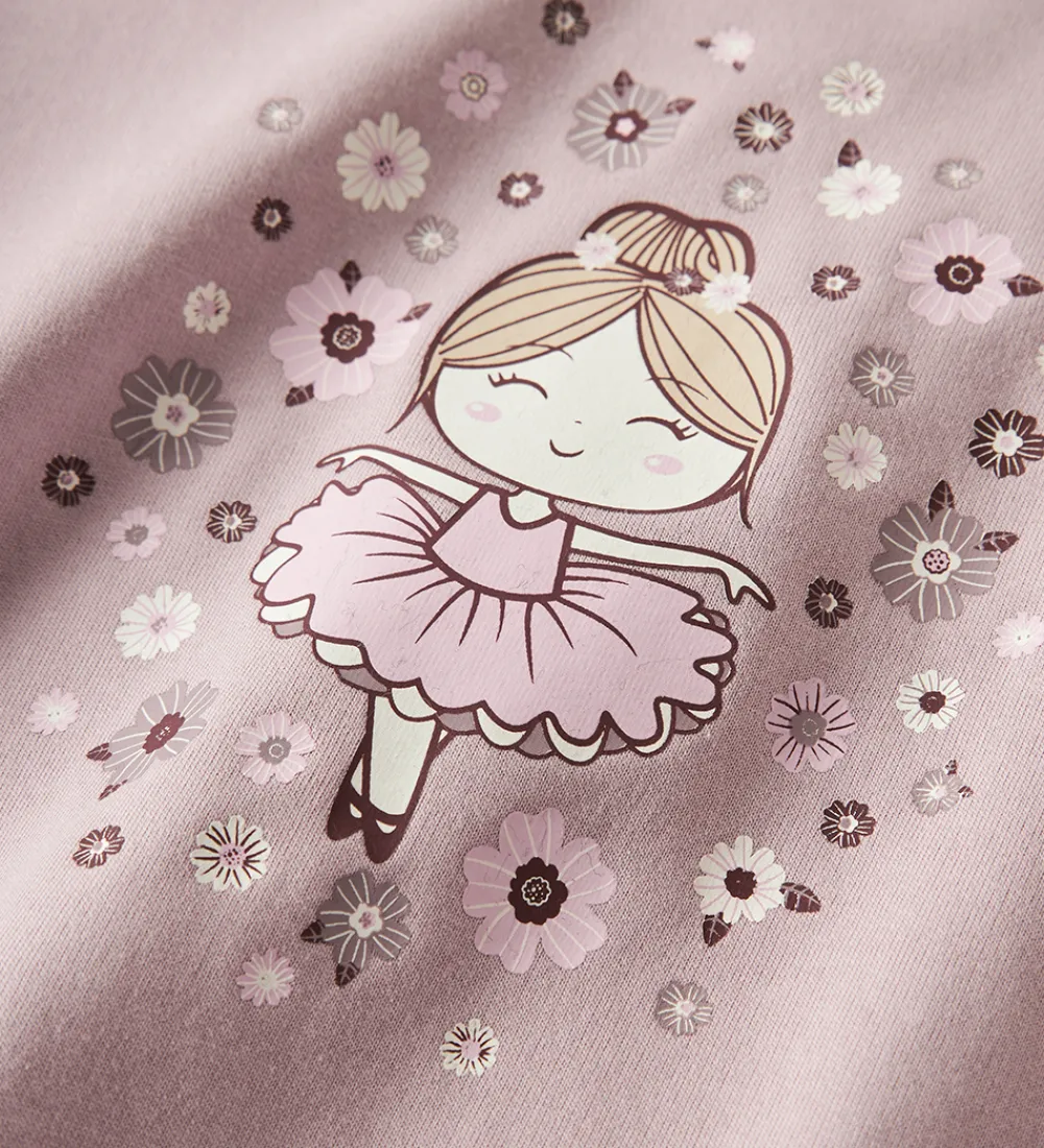 Charmerende Name It sweatshirt i en lys lilla nuance med et sødt balerinaprint omgivet af små blomster. Name It sweatshirten har lange ærmer og rund hals med ribkanter ved alle åbninger. Indvendigt er der blødt, børstet bomuld.