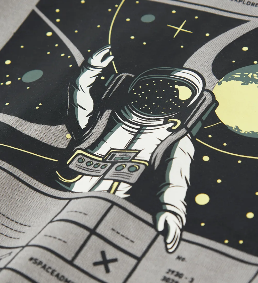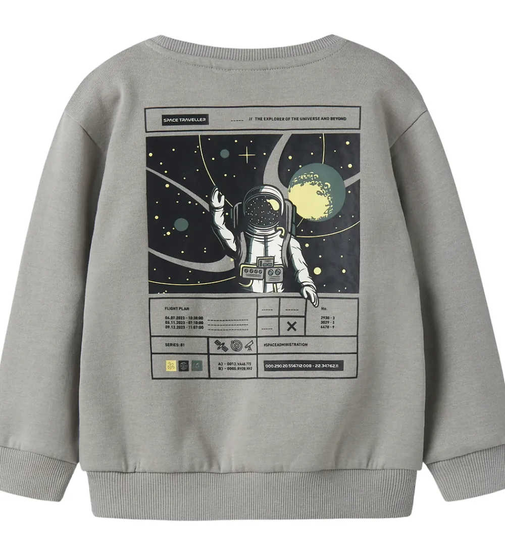 Smart Name It sweatshirt i en varm grå nuance med tre små motiver med rum-tema på venstre bryst. På ryggen er der et stort print af en astronaut i rummet samt tekstprint. Name It sweatshirten har en rund halsudskæring og lange ærmer med ribkanter ved alle åbninger. Indvendigt er der blødt, børstet bomuld.