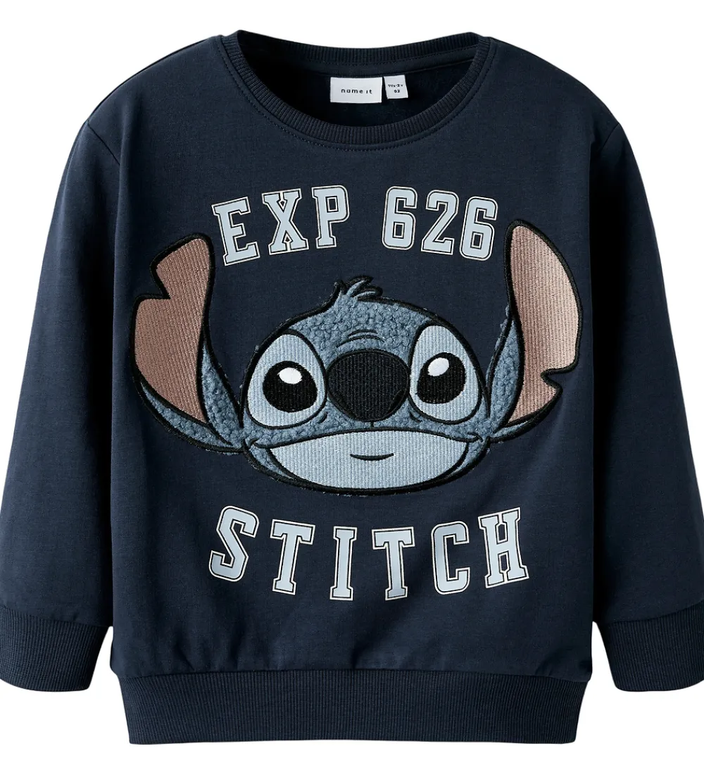 Fantastisk Name It sweatshirt i en dyb, marineblå farve, prydet med et charmerende motiv af Stitch og teksten “EXP 626 STITCH”. Name It sweatshirten har lange ærmer og en rund hals, som bidrager til et stilrent udtryk. De ribbede kanter fuldender designet.