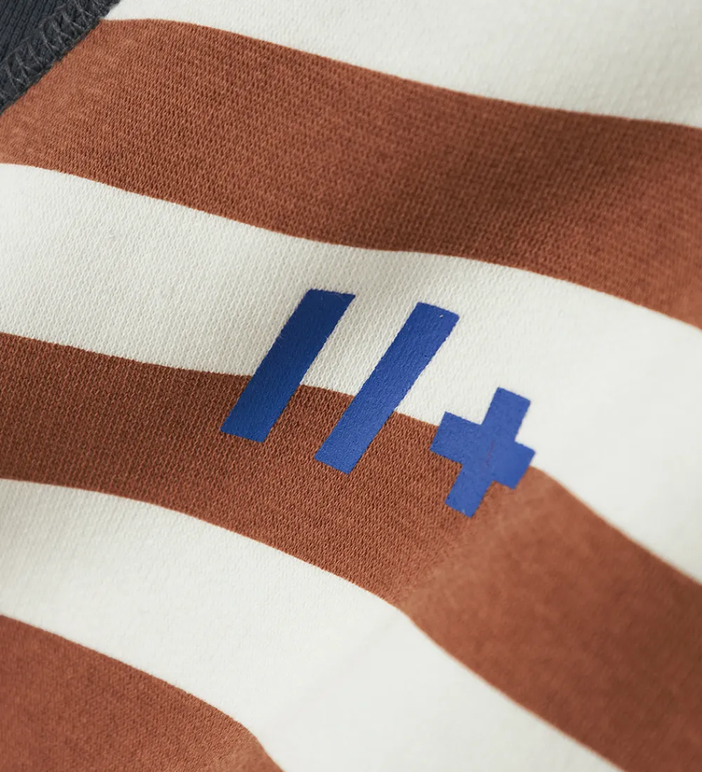 Smart Name It sweatshirt med vandrette striber i brun og hvid med mørkegrå ribkanter. Sweatshirten har et print på venstre bryst med tegnene “//+” i blå. Den har en rund halsudskæring og lange ærmer med ribaknter. Indvendigt er der blødt, børstet bomuld.