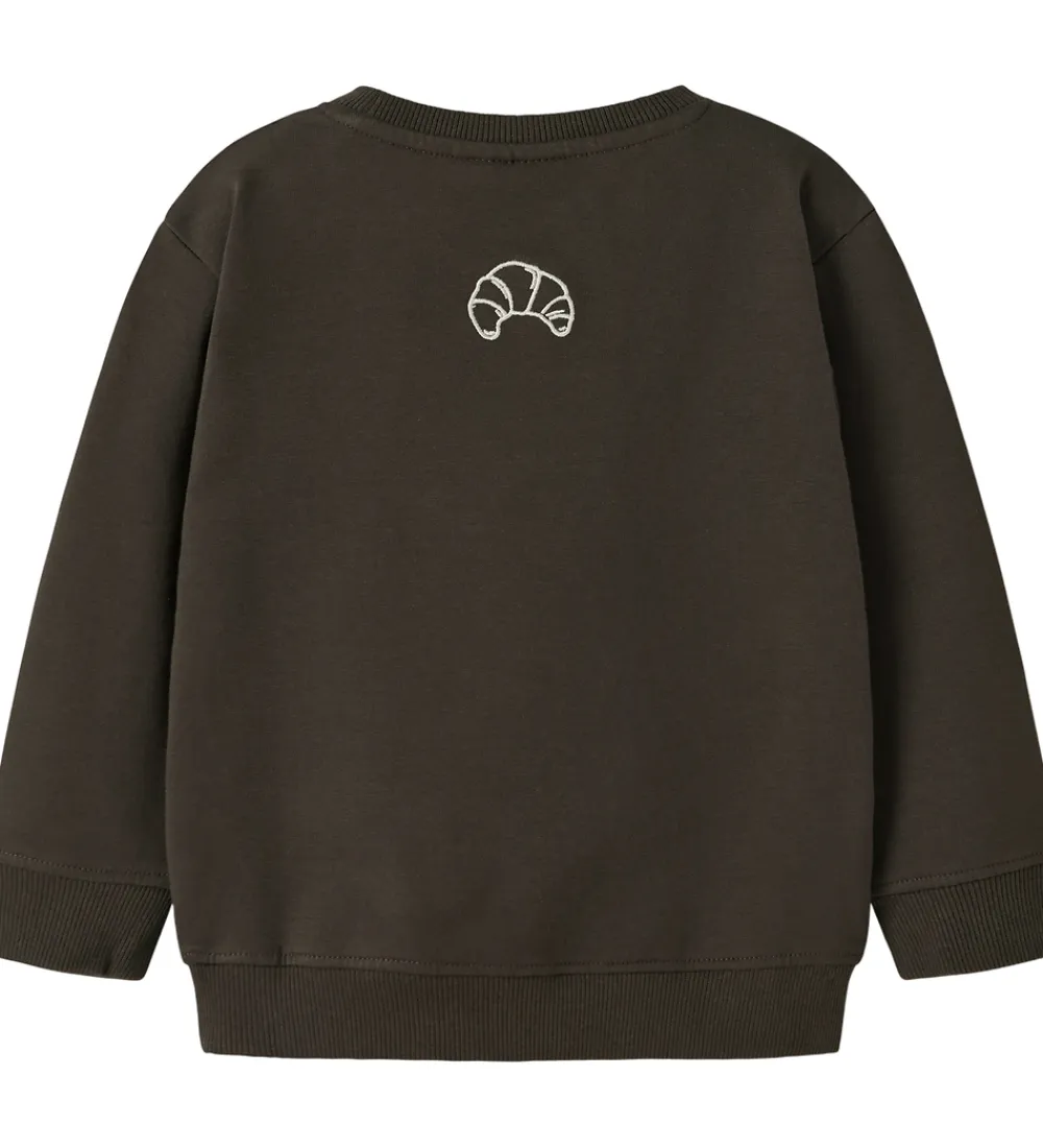 Flot Name It sweatshirt i mørkebrun med print af en crossaint og teksten “Croissant Best Quality Est. 1986” på fronten. I nakken er der broderet en beige crossaint. Name It sweatshirten har en rund halsudskæring og lange ærmer med ribkanter. Indvendigt er der blødt, børstet bomuld.