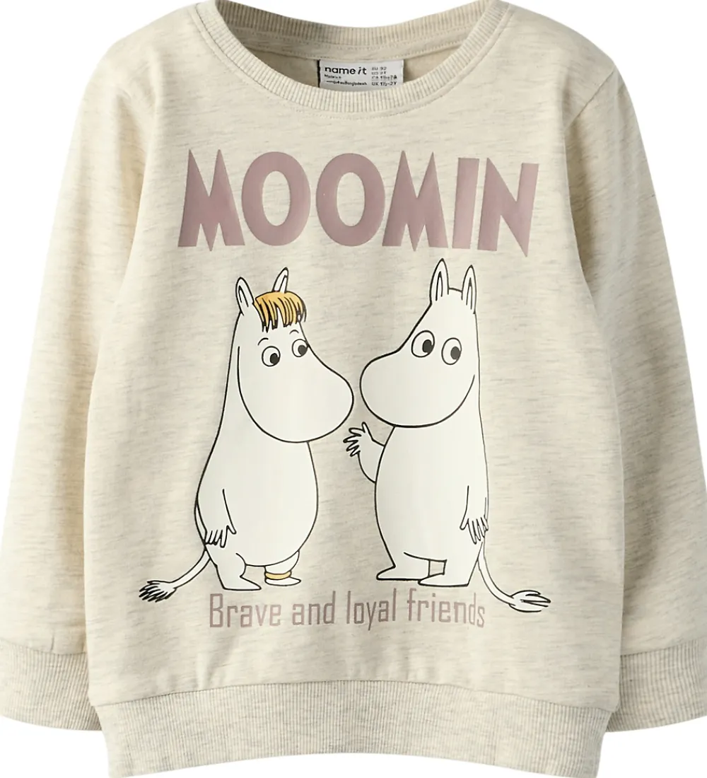 Charmerende Name It sweatshirt i en meleret, lysebeige nuance med et motiv af Mumitroldene. Name It sweatshirten har lange ærmer og rund halsudskæring, hvilket giver et enkelt og rent udtryk.