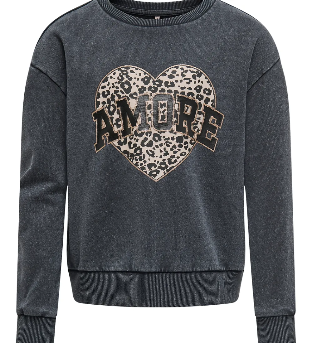 Smart Kids Only sweatshirt imørkegrå med et stort hjerte i leopardprint på fronten med teksten “Amor” og detaljer i guld glimmer. Kids Only sweatshirten har lange ærmer og rund hals med bred ribkant ved ærmer og talje. Indvendigt er der blødt, børstet bomuld.
