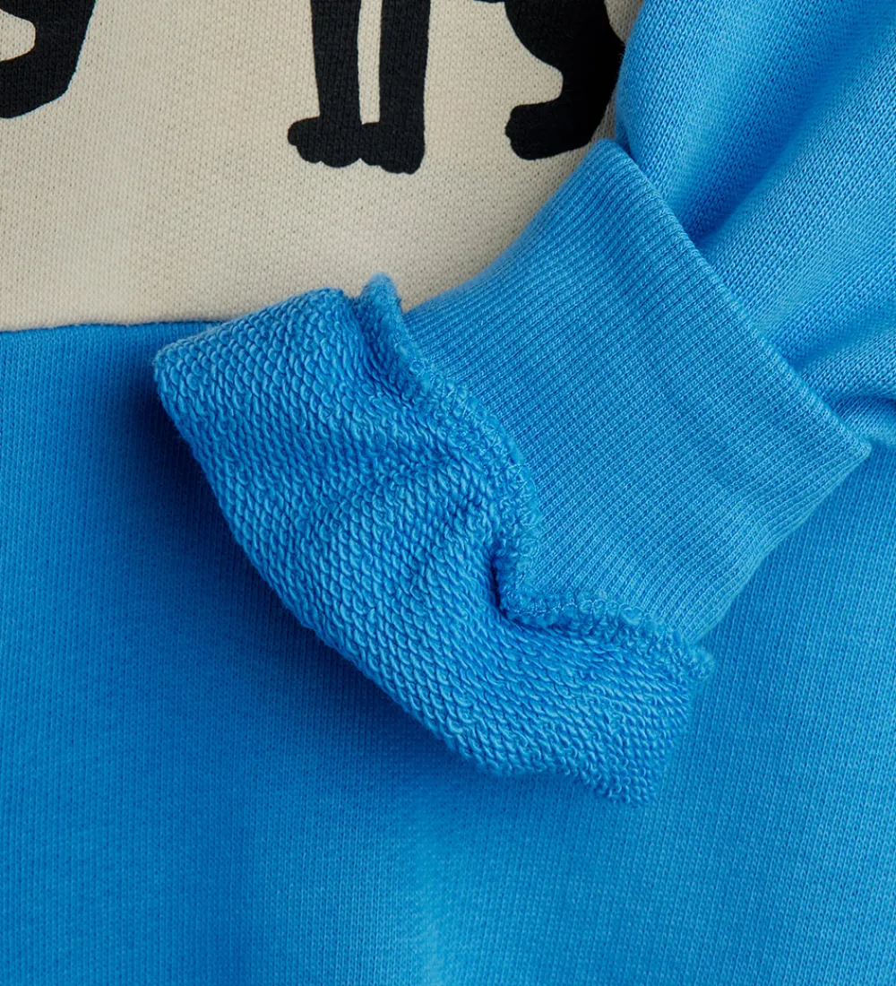 Elegant Mini Rodini sweatshirt i en klar, blå farve. Den har en hvid stribe på tværs af brystet, dekoreret med et mønster af sorte pantere. De lange ærmer og den runde hals fuldender det enkle design.