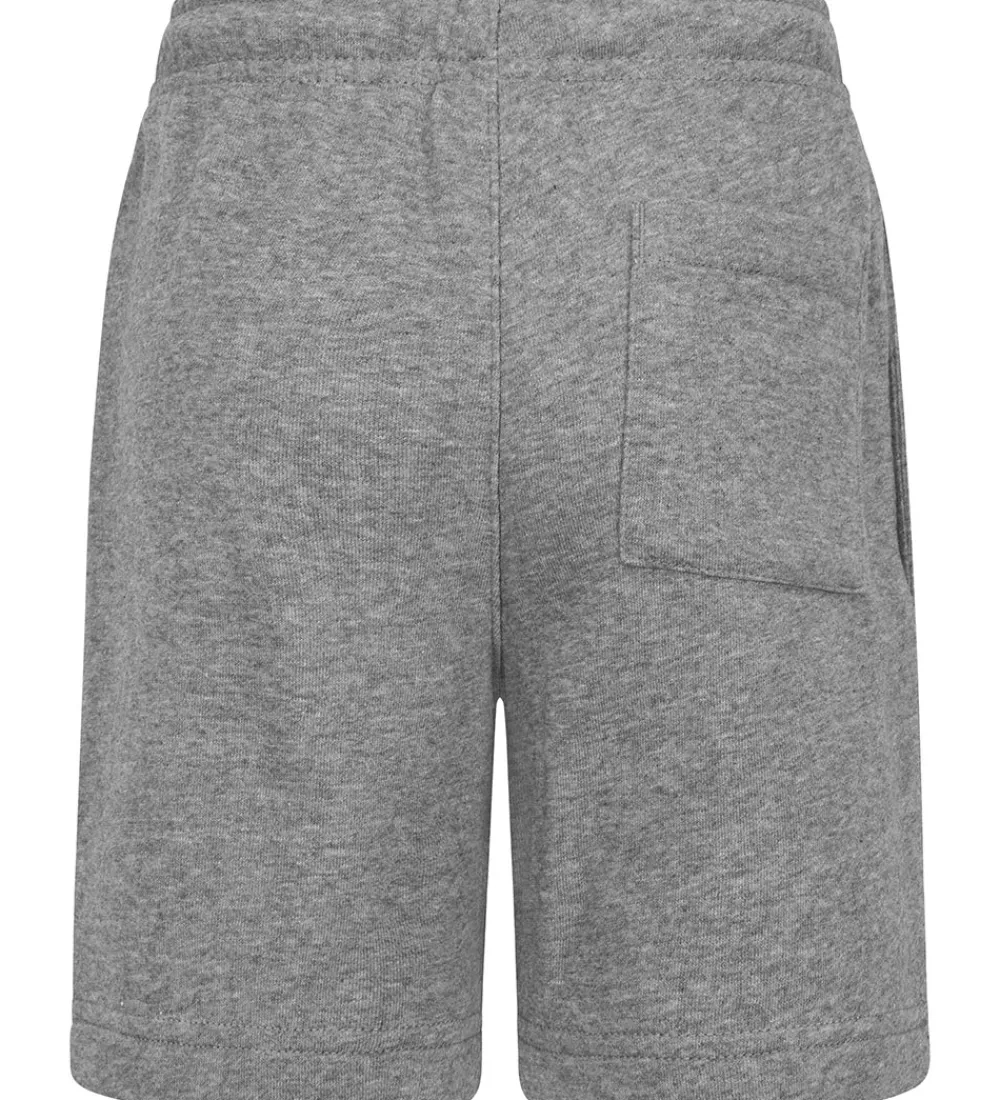 Dejlige Jordan sweatshorts i gråmeleret med et hvidt jumpman-logo broderet på venstre ben. Sweatshortsene har en elastisk taljekant med snøre, der giver en justerbar pasform, og en åben baglomme i højre side. På indersiden er der blød, børstet bomuld.