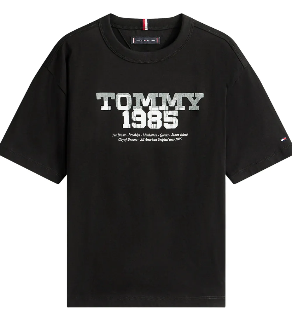 Elegant Tommy Hilfiger t-shirt i sort med et stort, tydeligt tryk på forsiden. Tommy Hilfiger t-shirten har en klassisk rund halsudskæring med en smal ribkant. Den lille logo på ærmet giver et subtilt touch til designet.