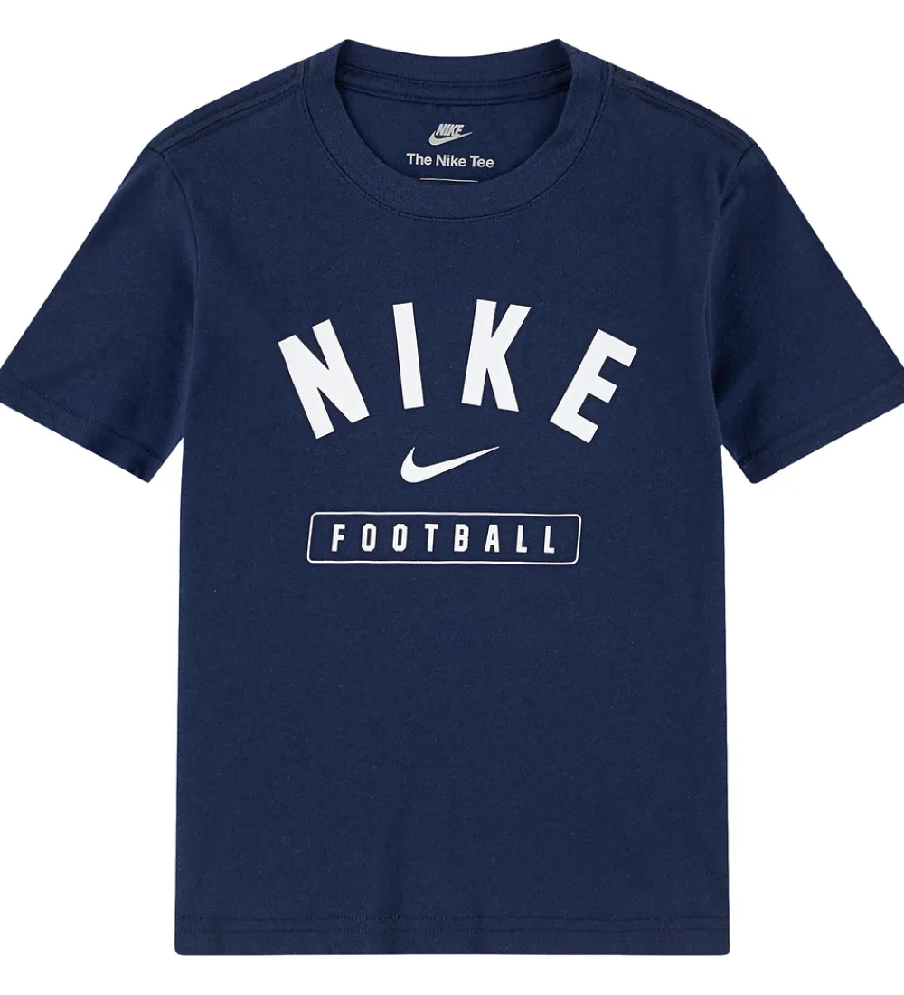 Flot Nike t-shirt i en klassisk navy farve. T-shirten har et sort Nike-logo med teksten “FOOTBALL” trykt på forsiden, hvilket giver et sporty udtryk. Nike t-shirten har en rund halsudskæring og korte ærmer, som passer til en enkel stil.