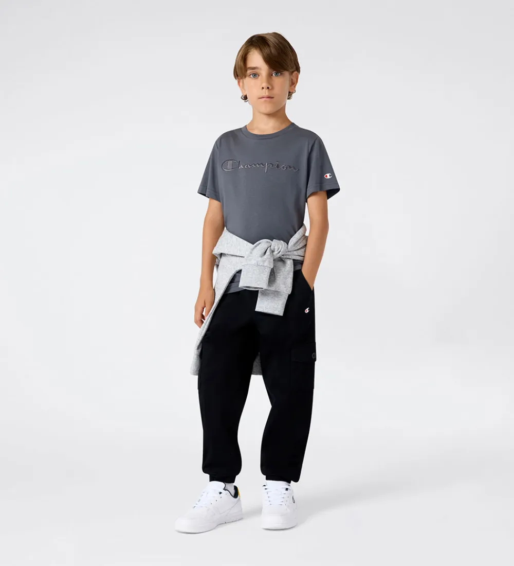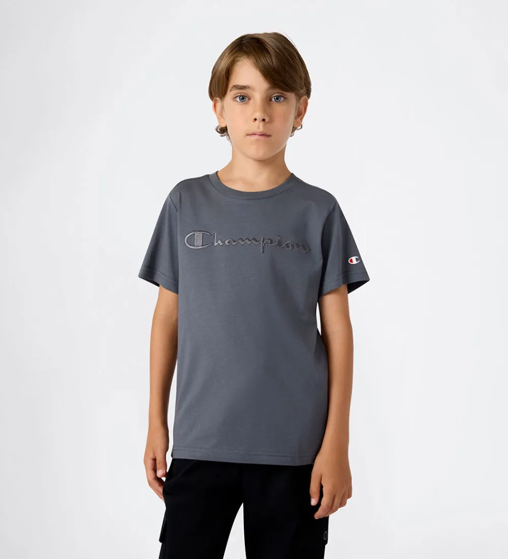 Smart Champion t-shirt i mørkegrå med et stort, broderet logo på brystet i samme farve som t-shirten. Champion t-shirten har en rund halsudskæring med en smal ribkant og korte ærmer.