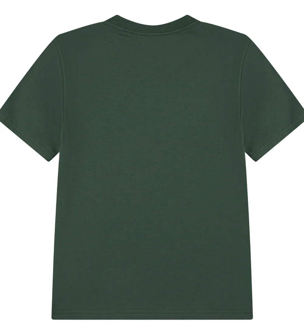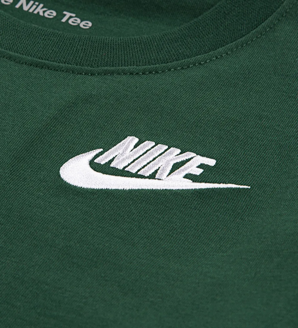 Flot Nike t-shirt i en dyb grøn farve. T-shirten har et skarpt, hvidt Nike-logo printet på brystet, hvilket giver et rent udtryk. Den har en klassisk rund halsudskæring med en smal ribkant, der bidrager til t-shirtens enkle design. Nike t-shirten virker alsidig med sin helfarvede stil, der er nem at anvende.