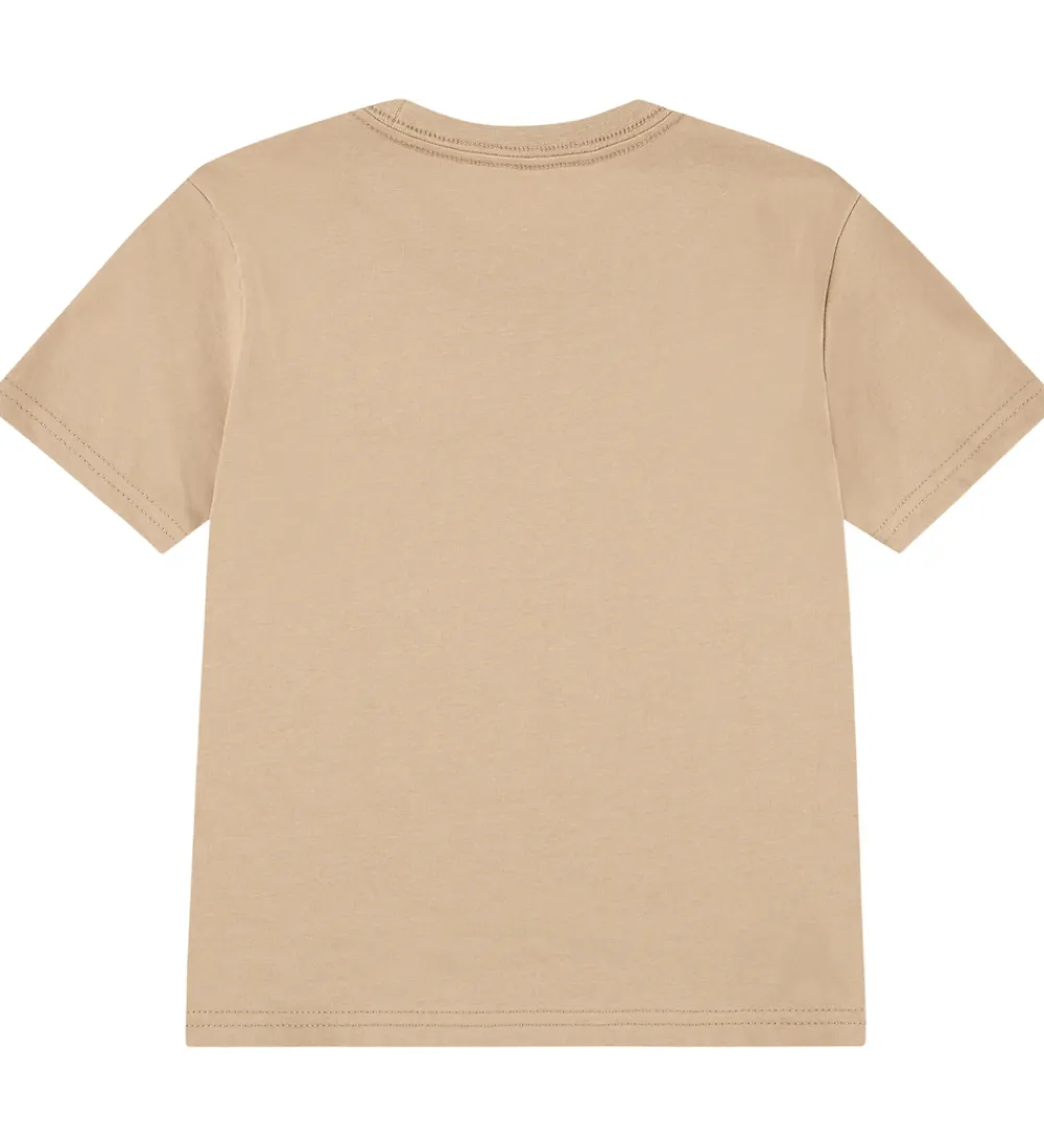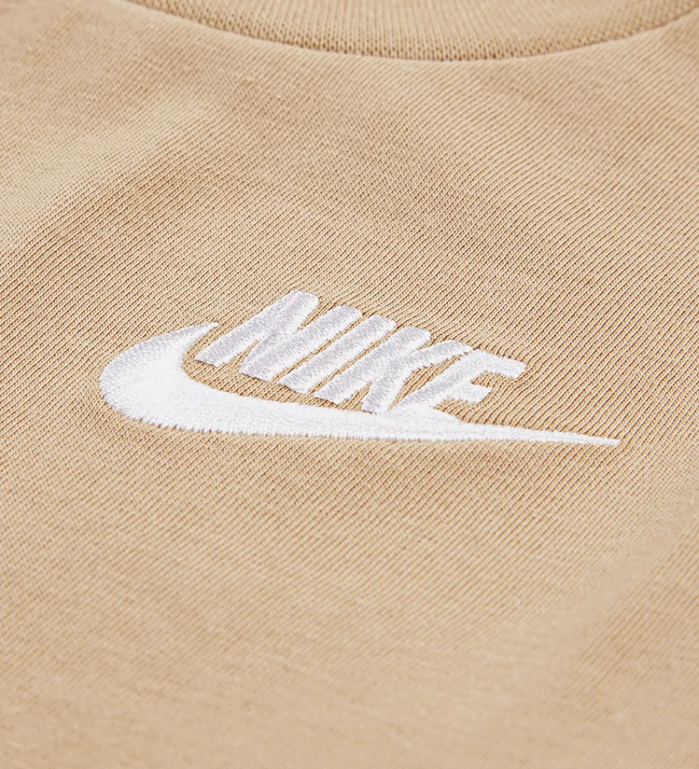Flot Nike t-shirt i en enkel beige farve. T-shirten har et klassisk design med det ikoniske Nike-logo trykt i hvidt på venstre side af brystet. T-shirten er udstyret med en rund halsudskæring, der har en smal ribkant, som giver en stilfuld detalje. Nike t-shirten har korte ærmer, som passer godt til det enkle og moderne look.