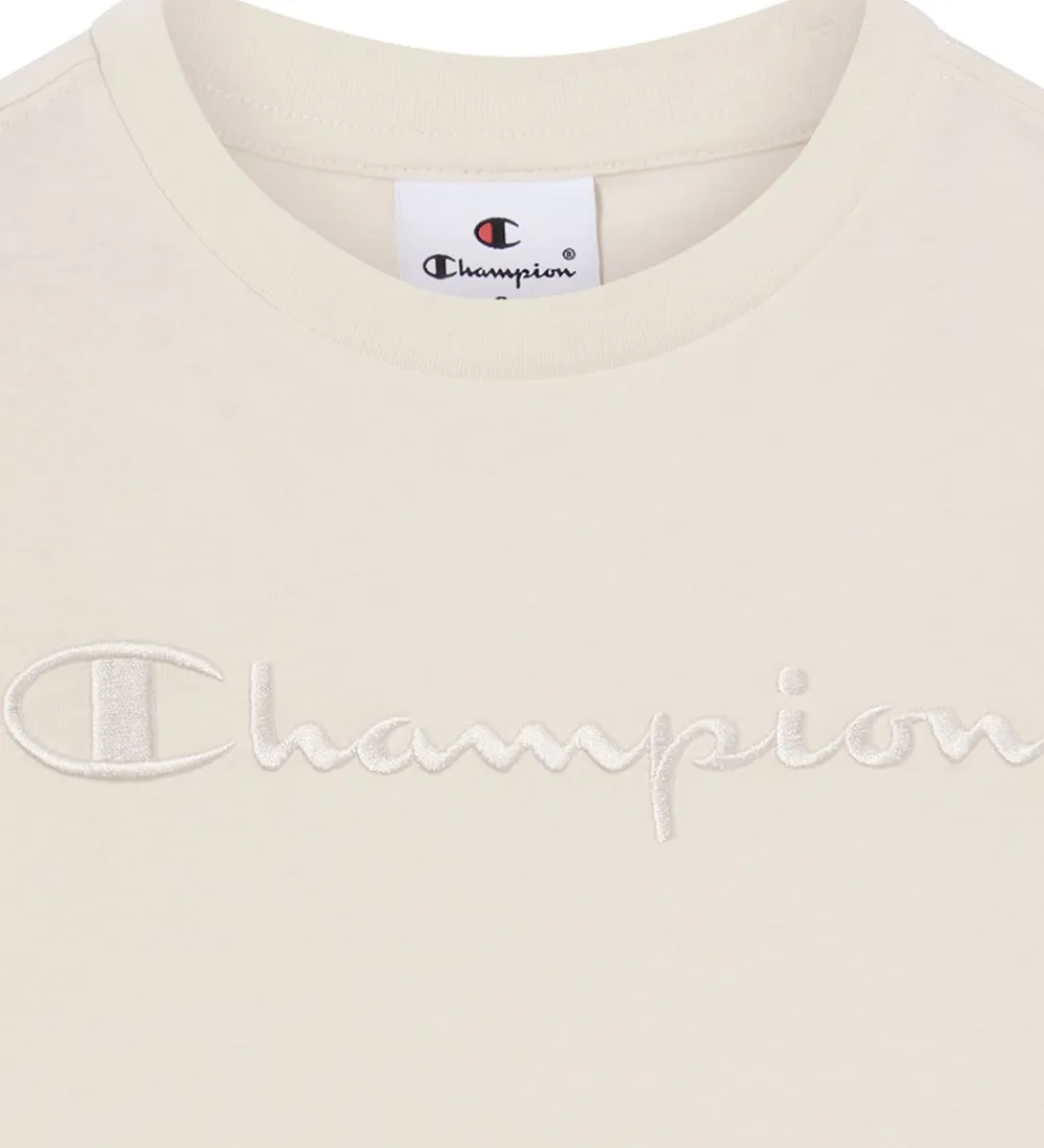 Skøn Champion t-shirt i beige med et stort, broderet logo på brystet i samme farve som t-shirten. Champion t-shirten har en rund halsudskæring med en smal ribkant og korte ærmer.