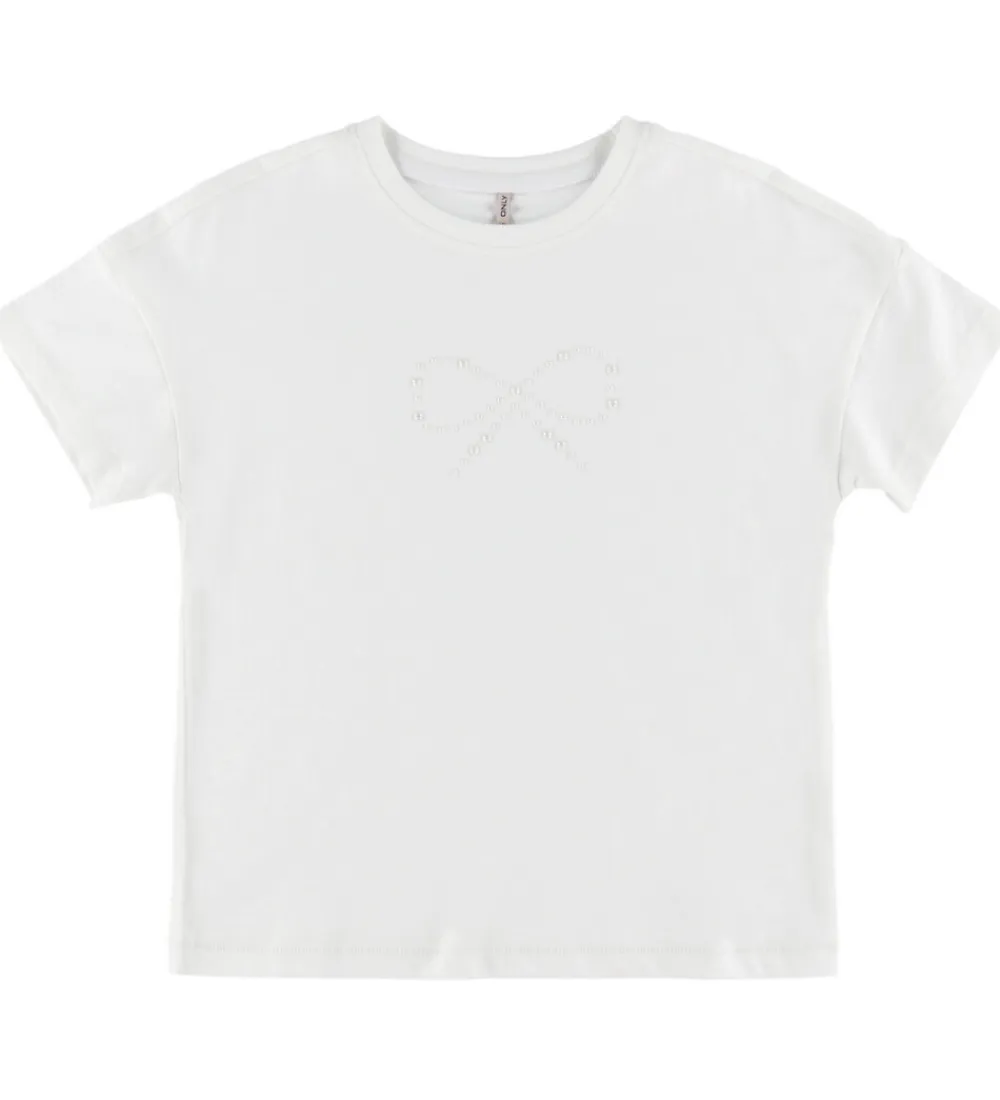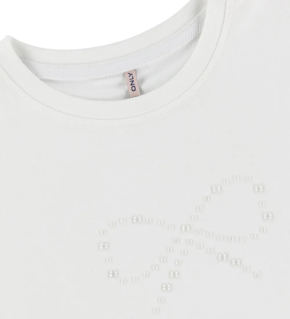 Elegant t-shirt fra Kids Only i en klassisk hvid farve. T-shirten har et diskret og fint mønster af en sløjfe på forsiden, lavet med små, stilfulde perler. Den har en rund halsudskæring med en smal ribkant, som giver et minimalistisk touch. T-shirten har korte ærmer og en lige, løs pasform.