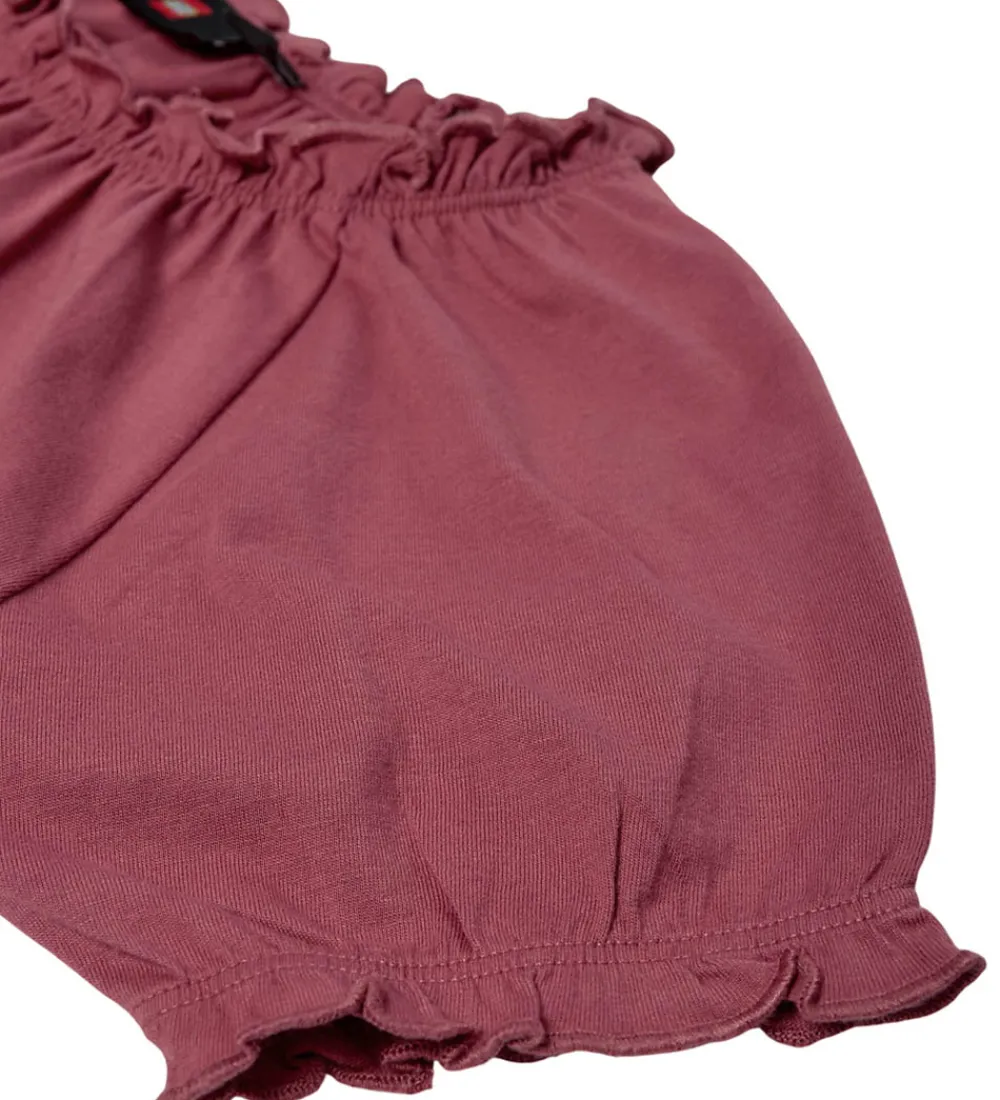 Charmerende LEGO® Wear t-shirt i mørk rosa og med fint blomster- og hjerteprint på brystet i lyse nuancer. Som en dekorativ detalje afsluttes halsudskæring og ærmer med en smal elastik- og flæsekant.