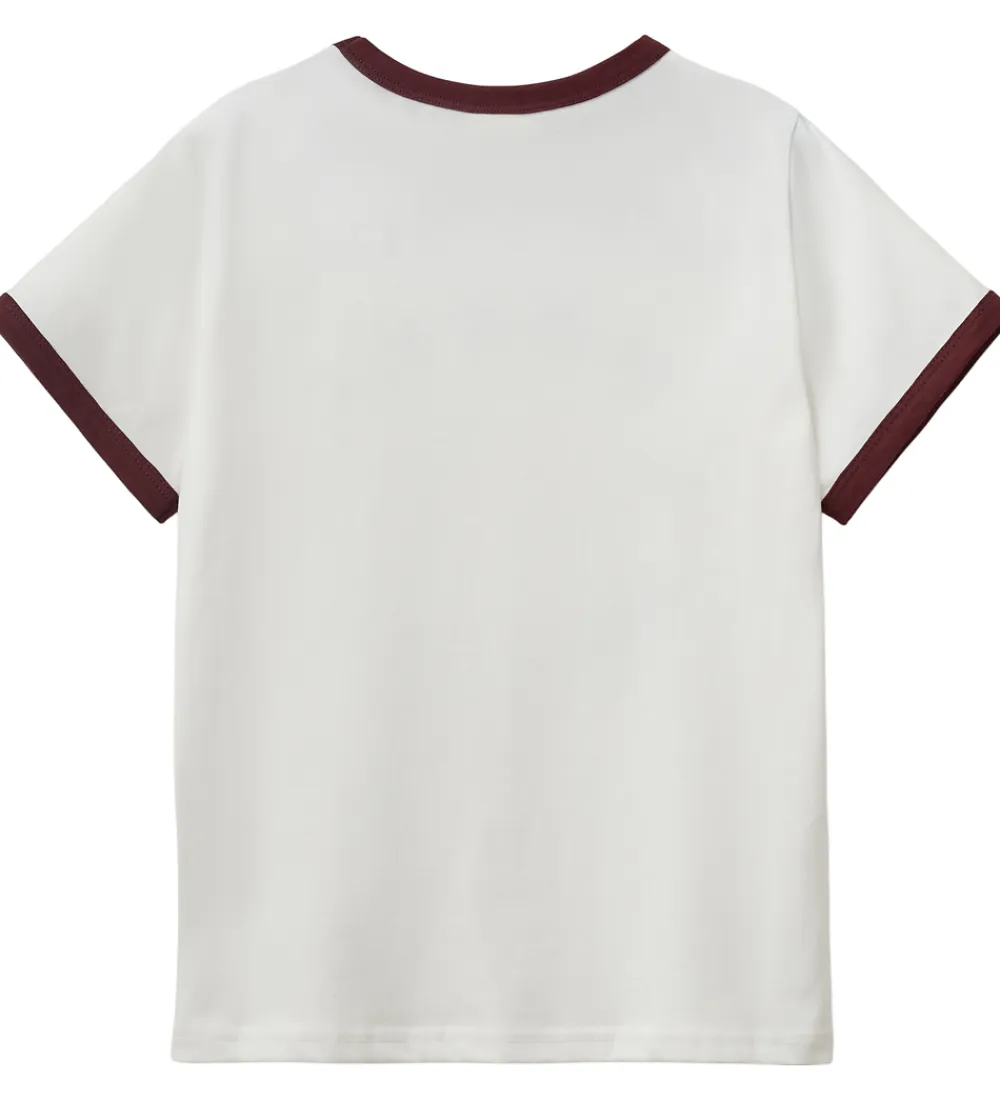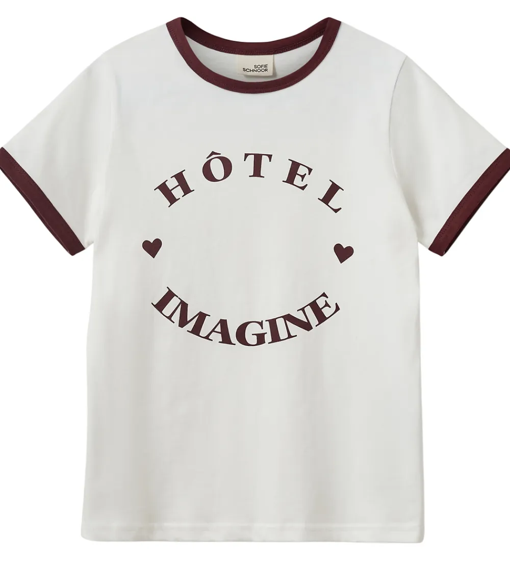 T-shirten er prydet med et dekorativt print, der består af teksten “HÔTEL IMAGINE” i en bue med to små hjerter. Printet er i en dyb bordeauxfarve, der matcher de bordeauxfarvede ribkanter ved halsudskæring og ærmer. Sofie Schnoor t-shirten har en rund halsudskæring, der fuldender looket.