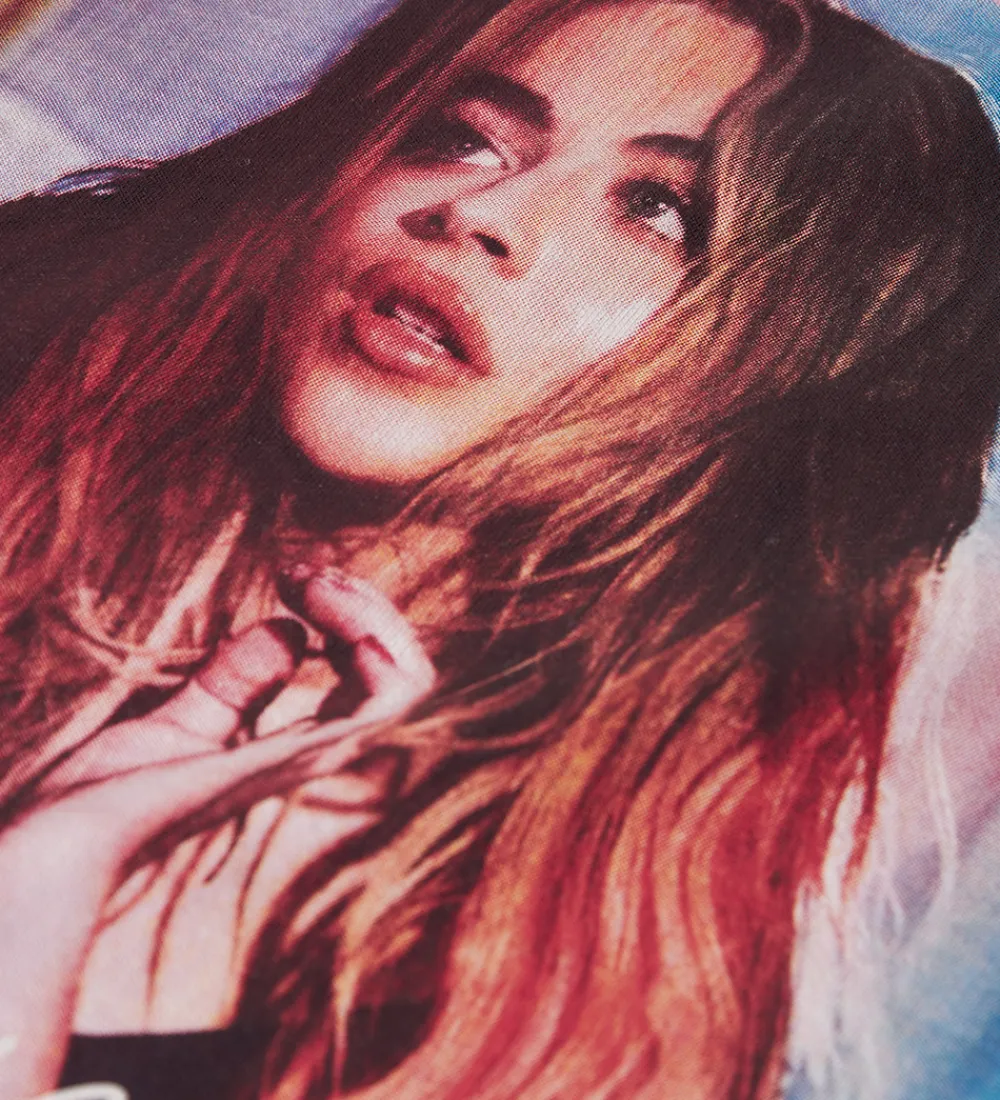 Fin Name It t-shirt i en sart, rosa farve med et markant fotoprint på fronten med en person og teksten “you got me thinkin’ nonsense” i hvid og rød skrift.